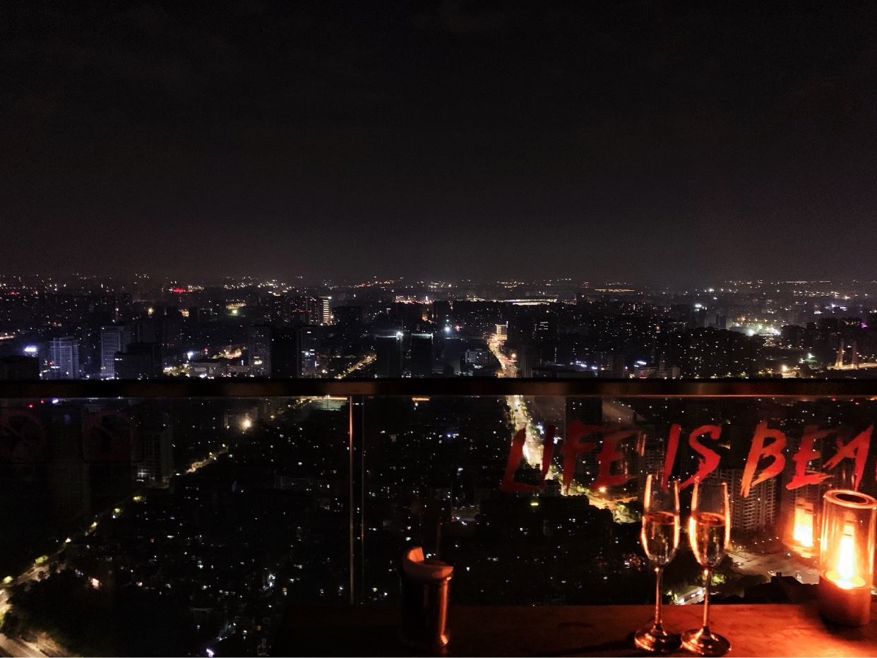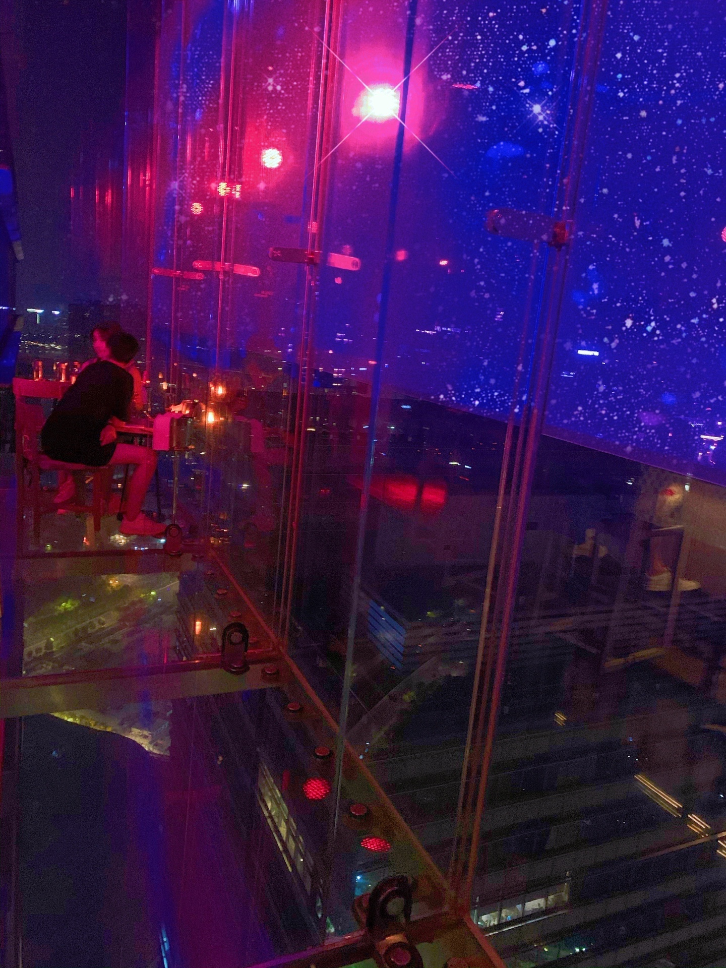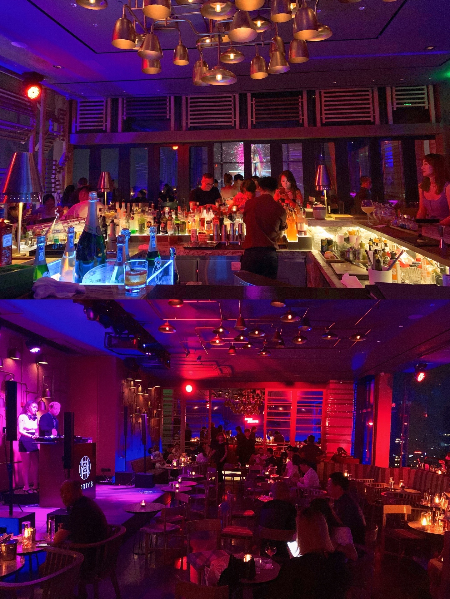 周末去的,几乎满座,DJ打碟处的正大厅小圆桌抵消2000,卡座抵消2500,透明悬空玻璃的景观位小圆桌抵消3千(提前预定,恐高者慎坐);隔壁的吧台及旁边的小圆桌不限低消;现在夏日凉风及抽烟🚬者极力推荐户外,一眼望去犹如能将整个繁华的钱江新城收入眼底,在夜景的衬托下杭城显得格外美腻;户外有两座玻璃房一座是VIP室,一座是卡座抵消,而正中间大屏播放着Victoria's Secret,颜值极高的小哥哥和小姐姐在意识清醒与模糊的边缘诉说心声😳……