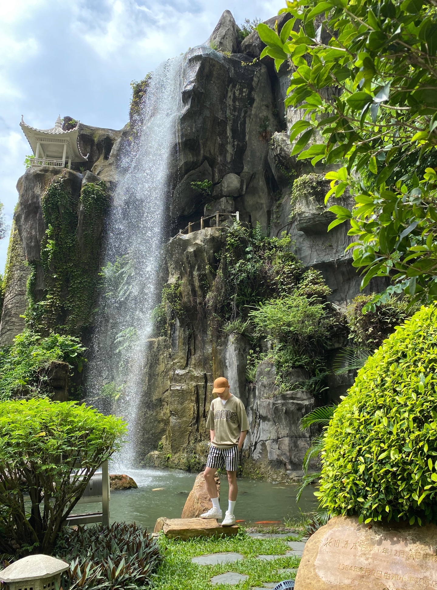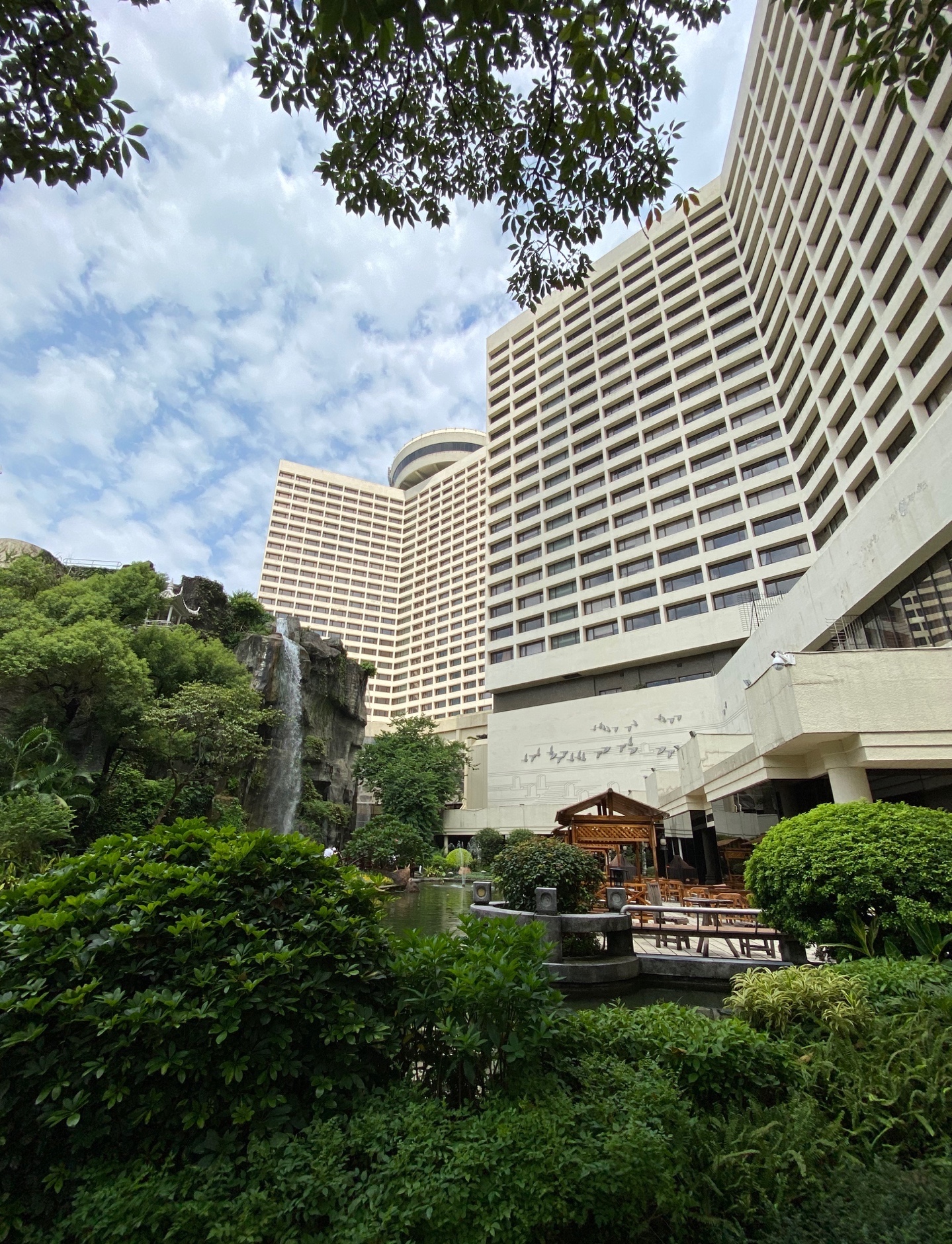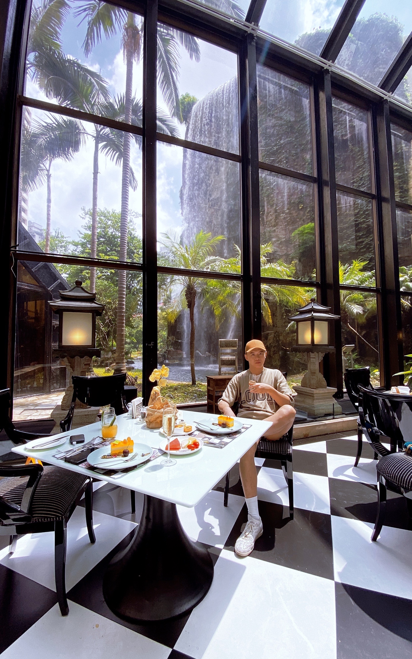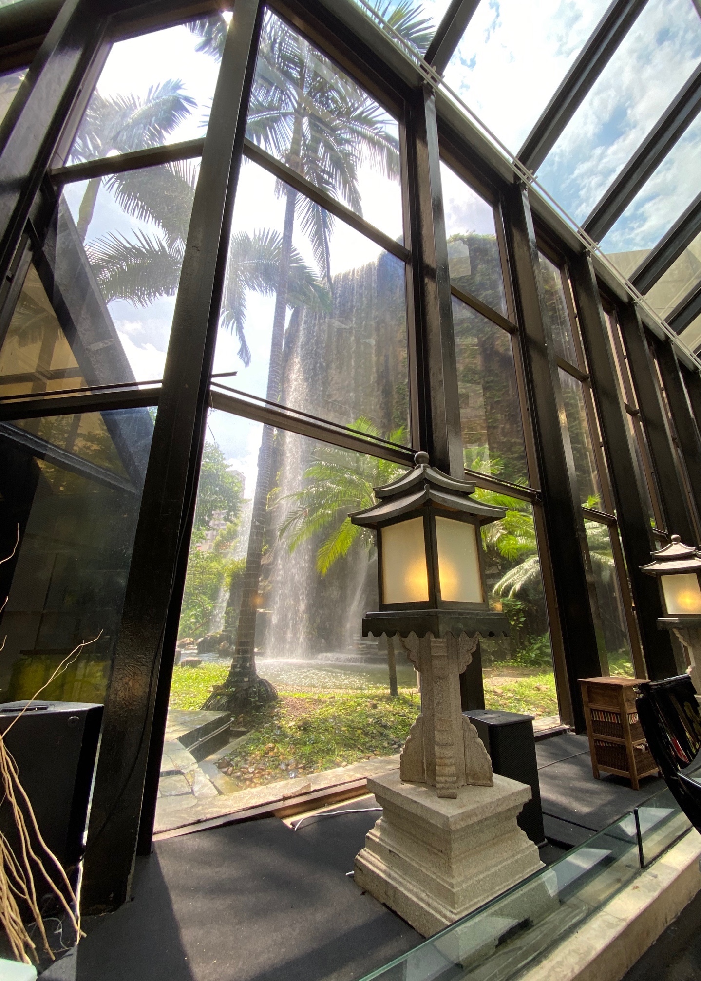 花园酒店是知名的建筑设计师贝聿铭在80年代设计的,酒店身后的园林如世外桃源一般,池塘里还养着锦鲤,这个吃的东西不怎么样却爆火的餐厅就是因为玻璃窗后的瀑布美景。我订了酒店的房包套餐,在入住时就和餐厅服务员预约好用餐时间,午餐时段还没到门口就已经有人在等位了,不过服务员还是帮我安排了最佳景观的位置(大概只有三桌是靠近瀑布景观的),任点任吃的自助午餐可选项很少,不要抱着能吃到美味的心态,所以大家就把能占据最佳拍片的桌位当成来此餐厅唯一的目的,后面陆陆续续来打卡的人感觉脸都黑了,还有客人跟服务员吵起架来,可见能占到这个位置还真需要些天时地利和人格魅力。