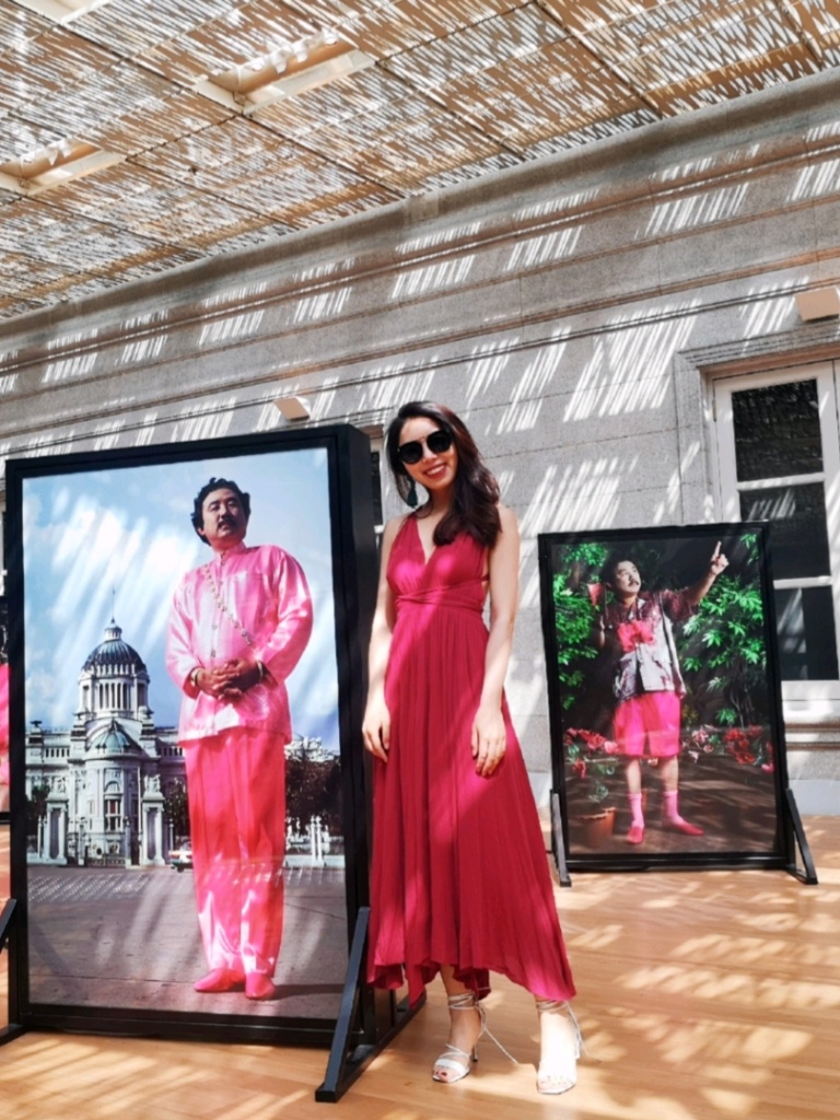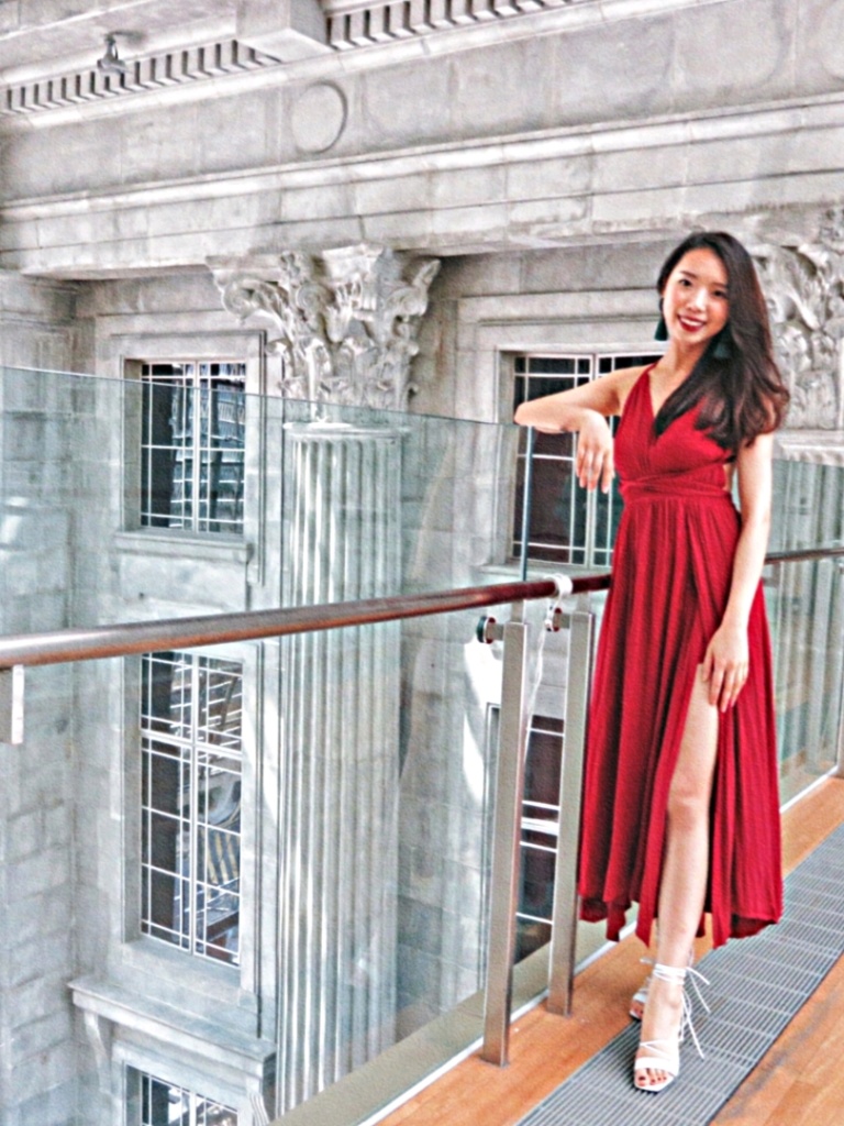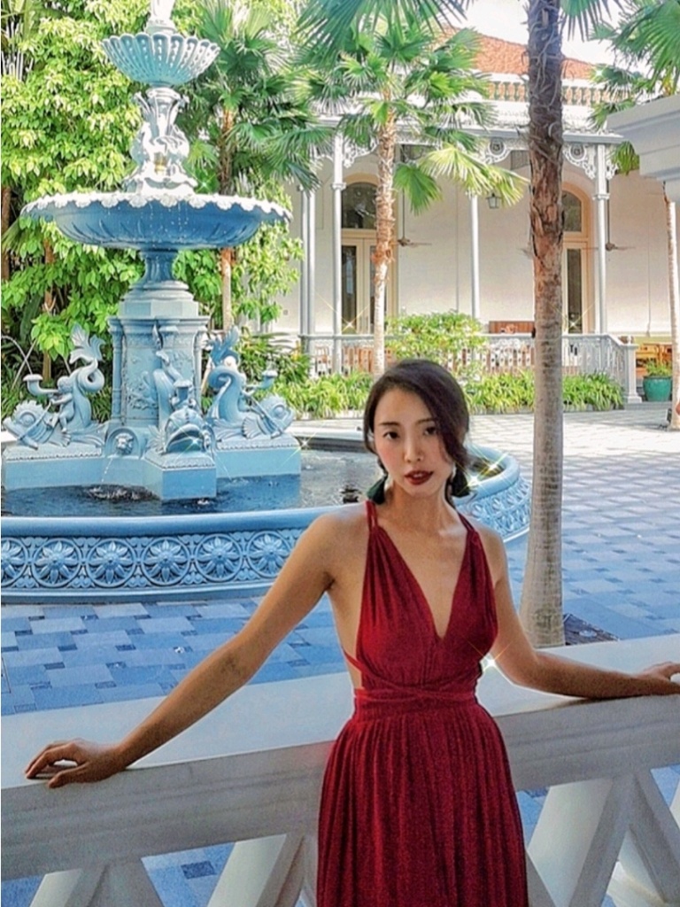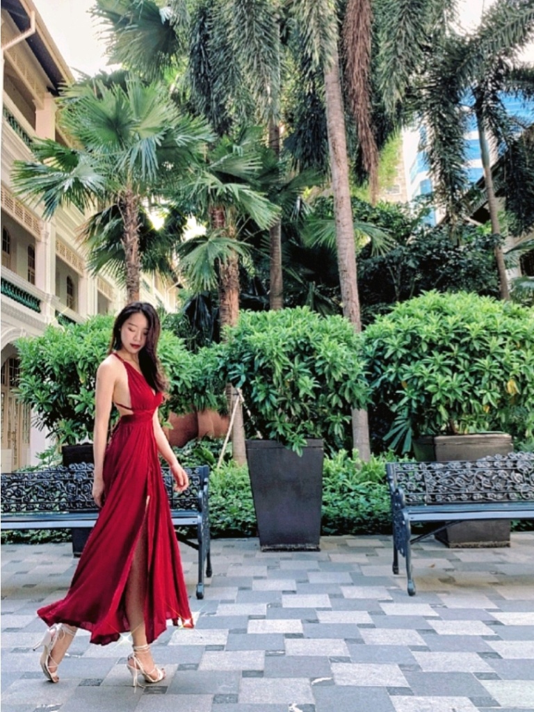整个酒店都已白色基调为主,服装上可以着亮色或调色,我的选择是红色露背长裙,在白墙下十分亮眼!