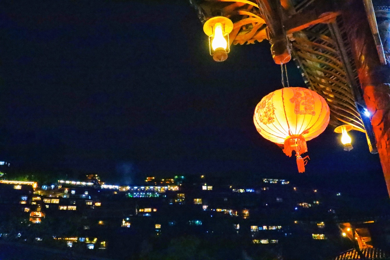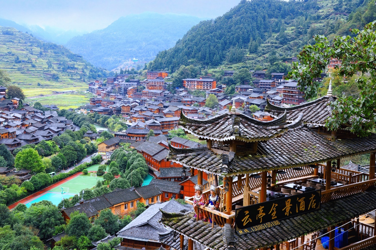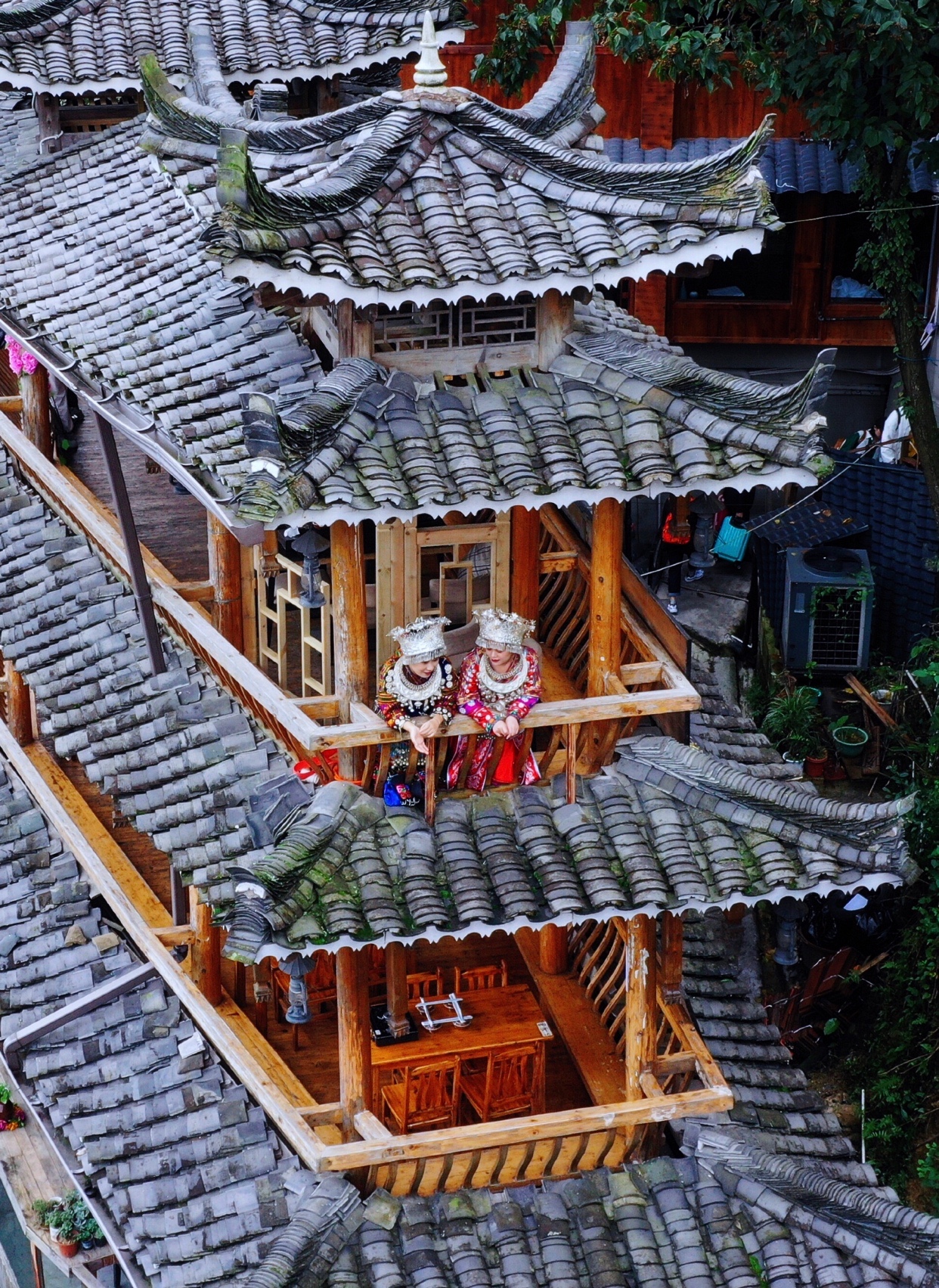 山顶的观景台人太多,我们避开人群往山下走,在半山腰找到家酒店,这里风景绝佳,能眺望整个苗寨,我们拍了很多美照。