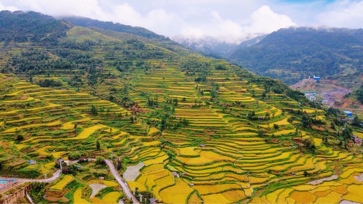 苗寨的廊桥很值得花时间去打卡,我们一上午走走停停,用各种角度去拍摄。秋天正是丰收的季节,梯田染上了金黄色,可以穿苗装走在梯田上拍照。