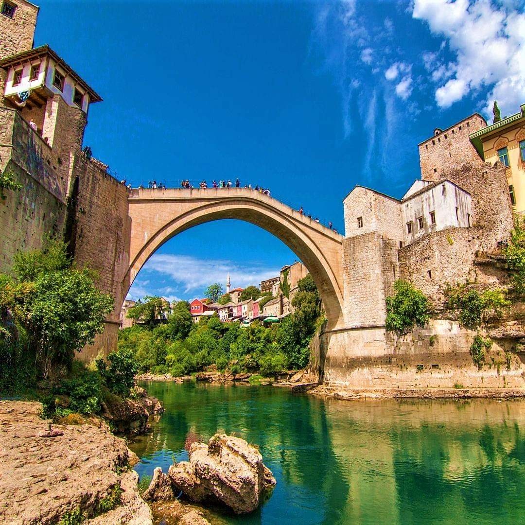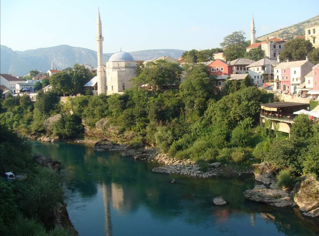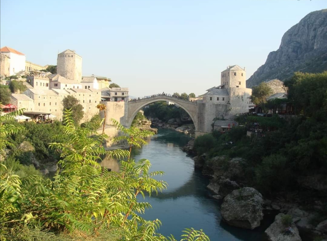古桥建于西元1557年,奥斯曼帝国国王苏莱曼一世下令在雷特瓦河的悬崖上建造这座古桥,桥的两头各有一座石砌桥头堡,与悬崖相连,古桥连结着两岸的两种宗教 文明: 东岸的回教清真寺宣礼塔,与西岸的克罗埃西亚区天主教教堂相对。