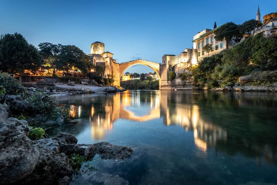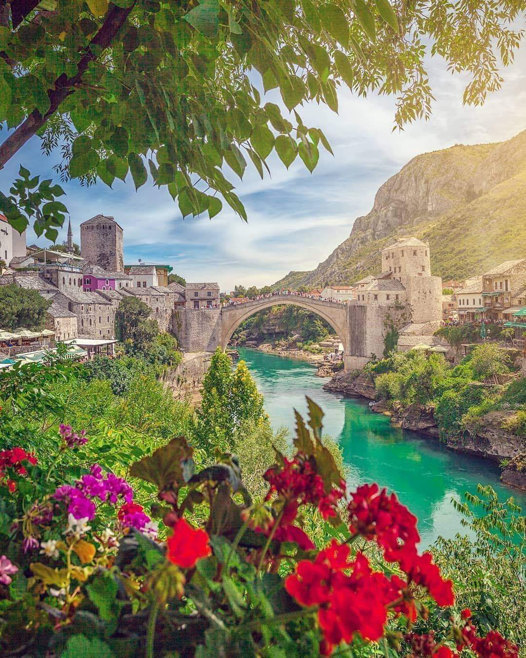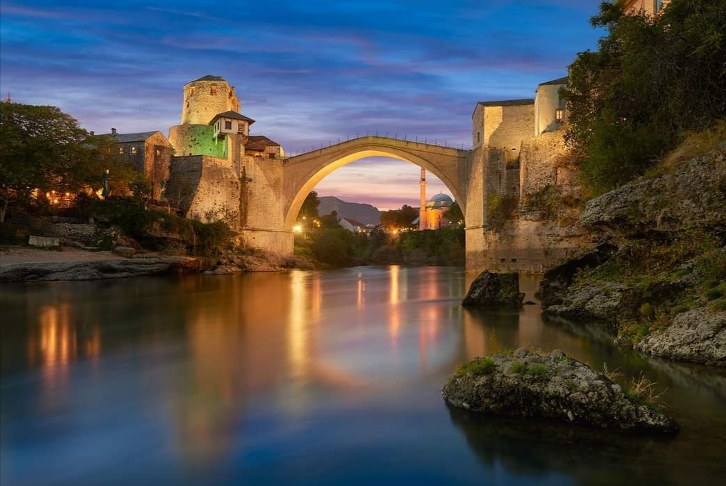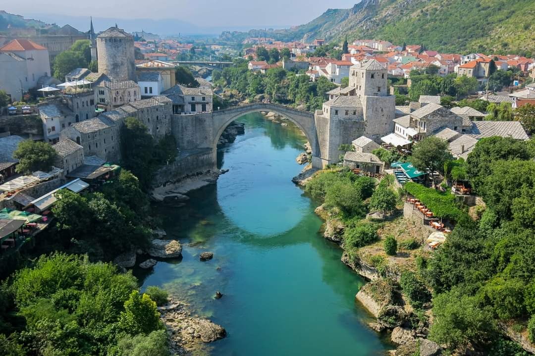古桥建于西元1557年,奥斯曼帝国国王苏莱曼一世下令在雷特瓦河的悬崖上建造这座古桥,桥的两头各有一座石砌桥头堡,与悬崖相连,古桥连结着两岸的两种宗教 文明: 东岸的回教清真寺宣礼塔,与西岸的克罗埃西亚区天主教教堂相对。