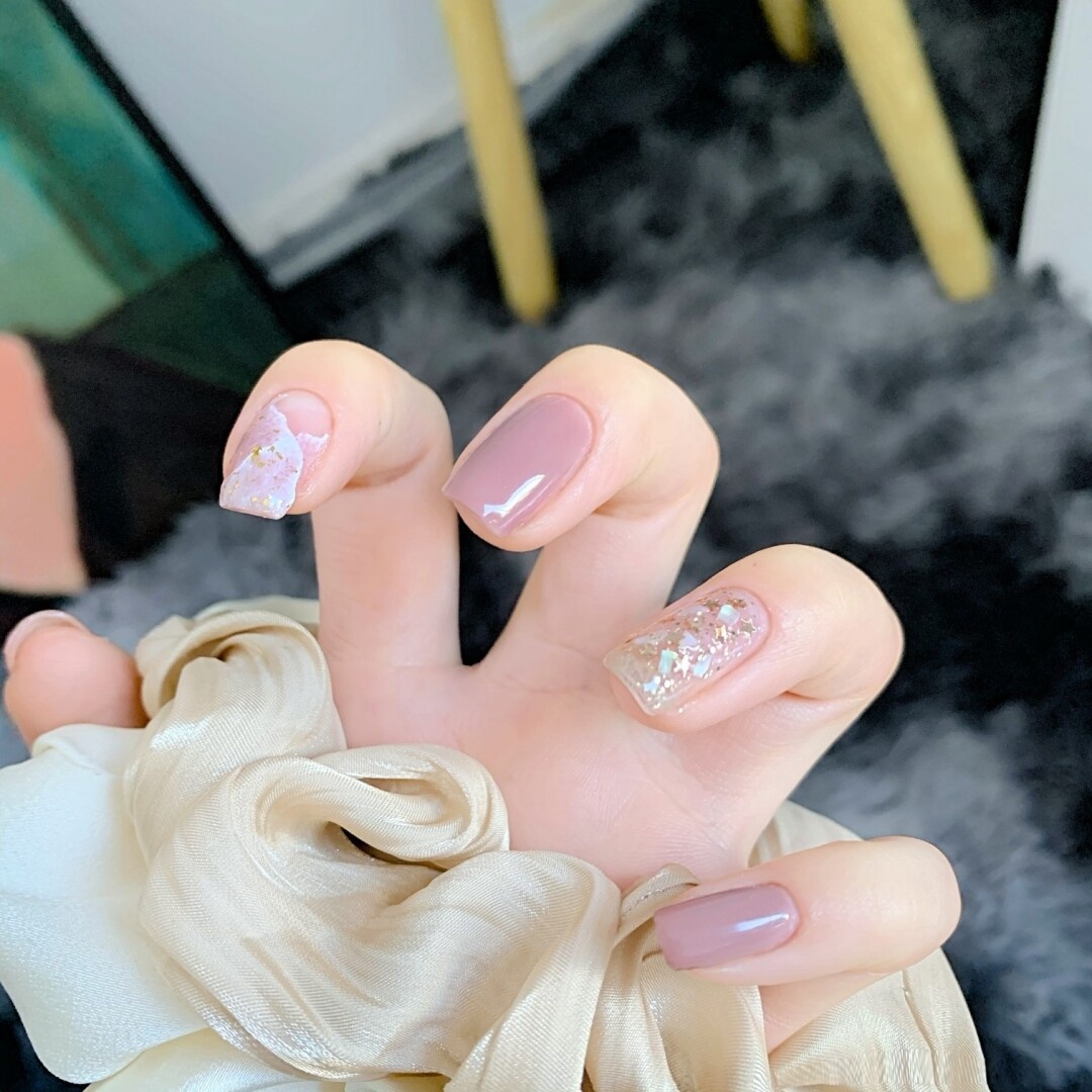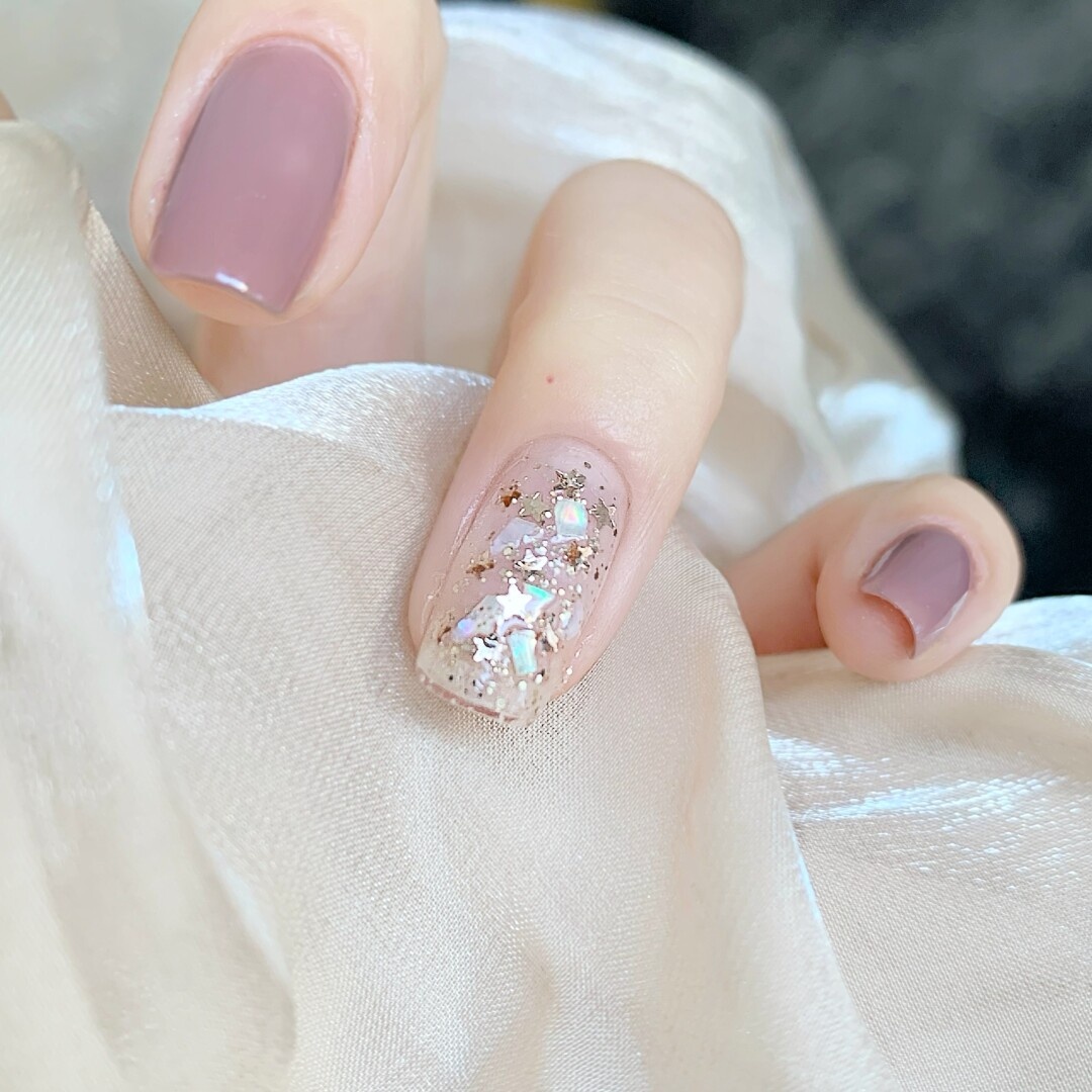 1⃣️大拇指薄涂一层H02,风干后刷D02亮片。看上去不扎眼的亚子,刷上去亮眼百搭哦!