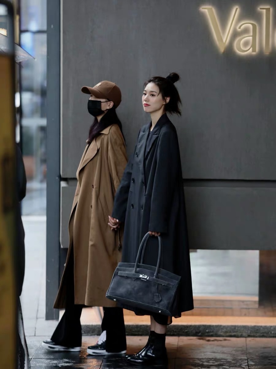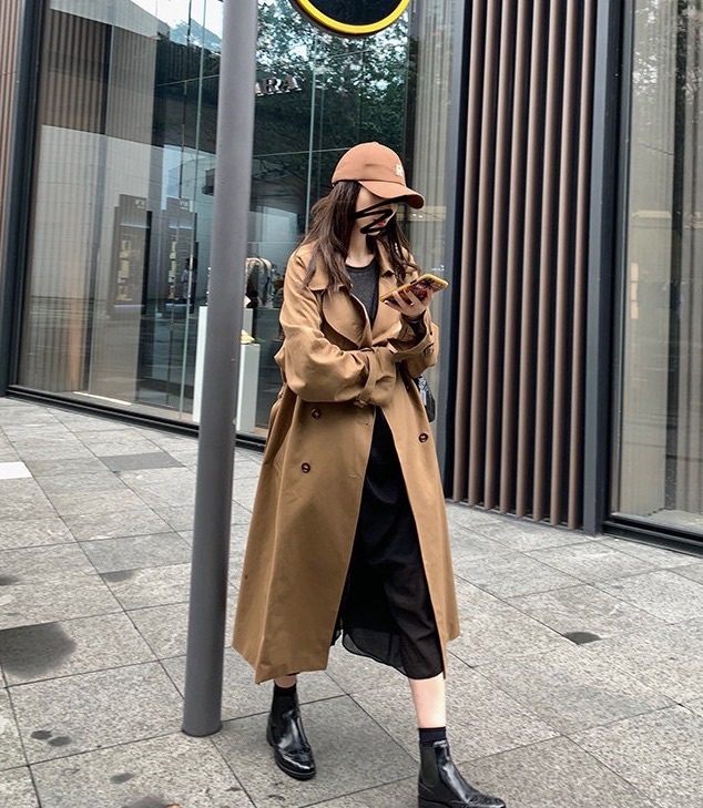 图二这张街拍被疯传。卡其色就是这款 气场两米的风衣,搭配的裤子是开叉神裤(强烈建议入的裤子)