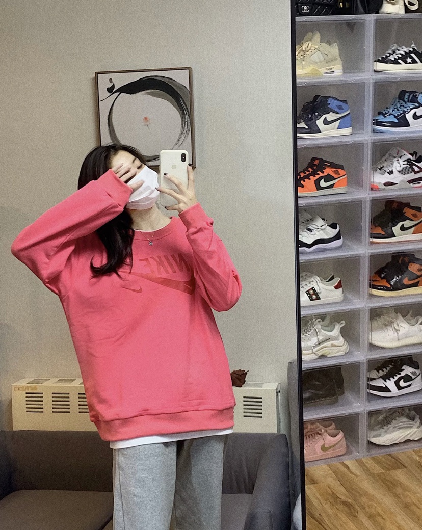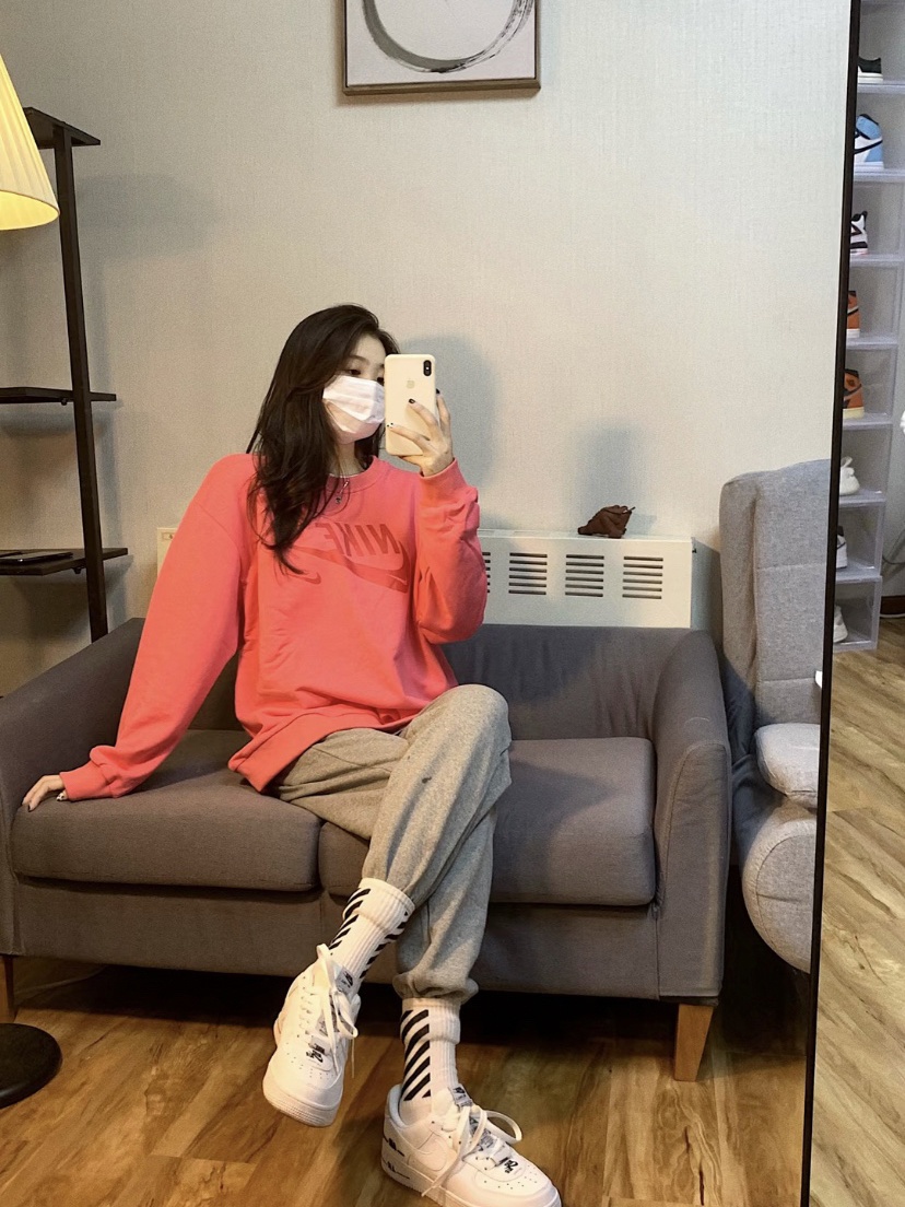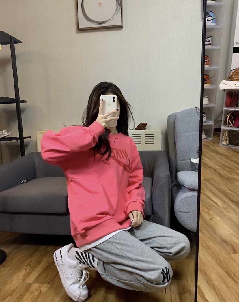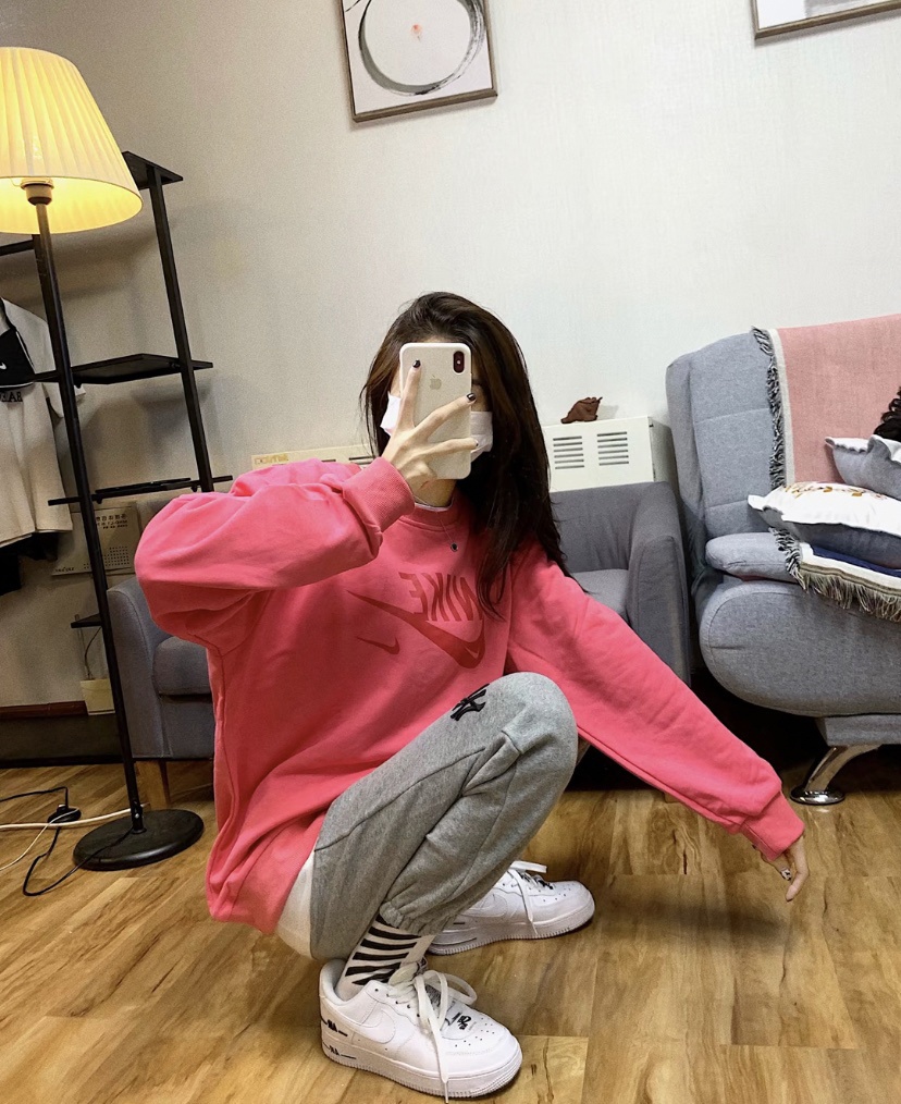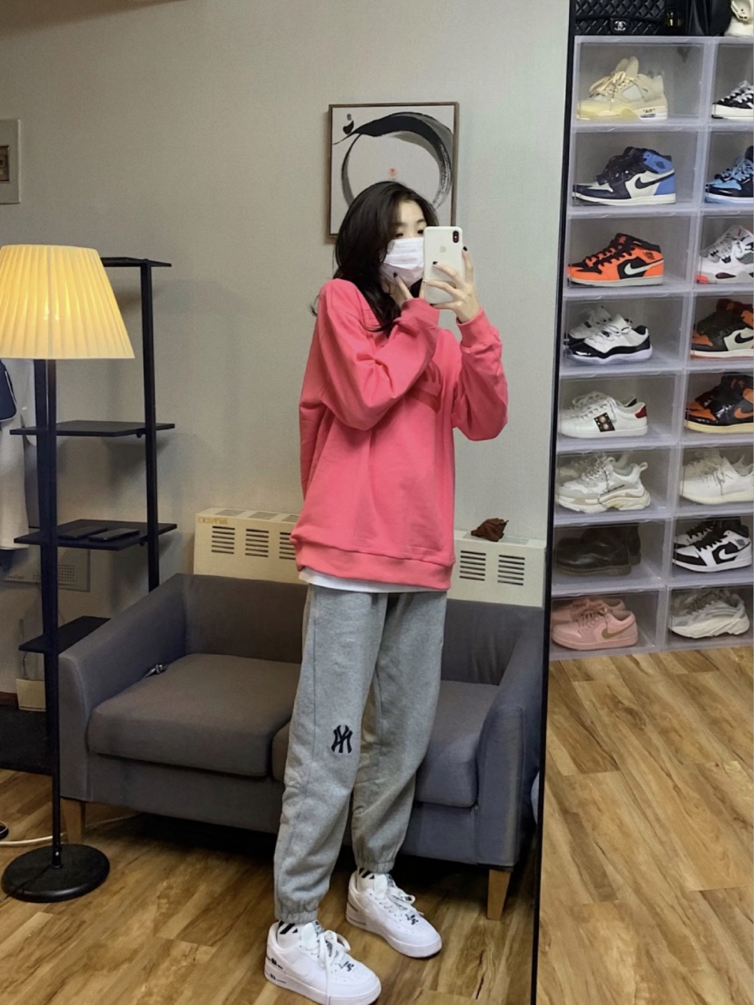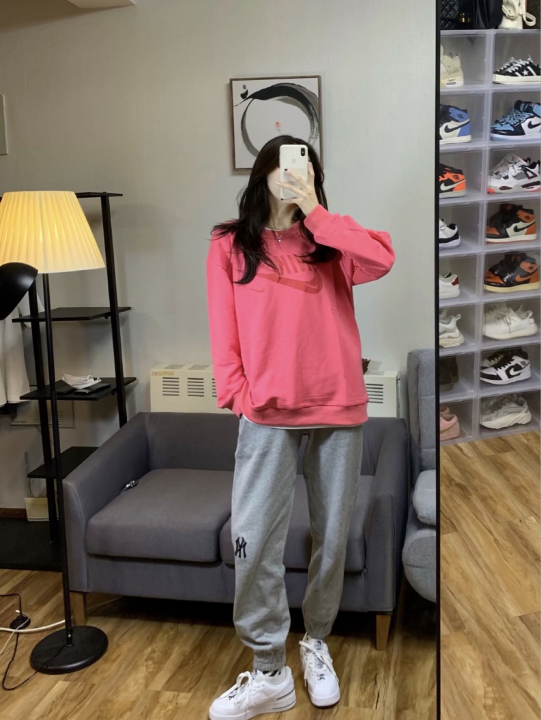 耐克粉色卫衣 这个卫衣太好看啦 很显白搭配的是NY灰色束脚裤 粉色与灰色的色系给人感觉很温柔哦鞋子是空军一号串标 继经典空军纯白后又一双无敌百搭的鞋子