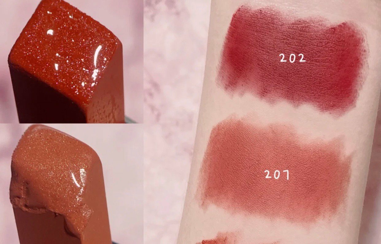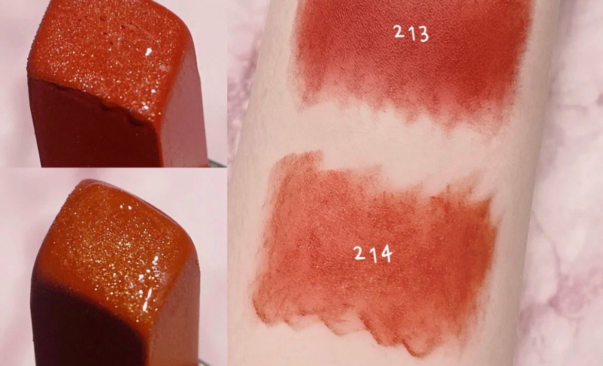 214颜色不饱和,带点红绸的南瓜橘红,不荧光,颜色也不深,超级提气色。关键是质地是哑光,有种南瓜泥的感觉哟💃💃💃