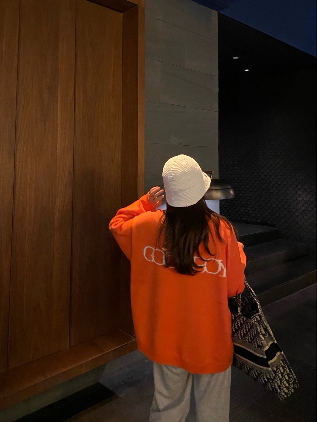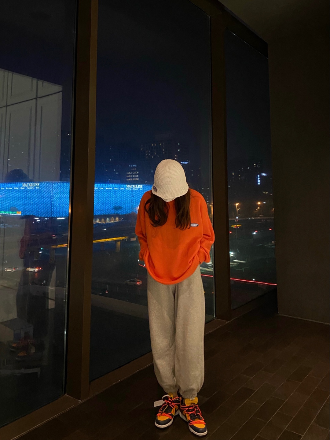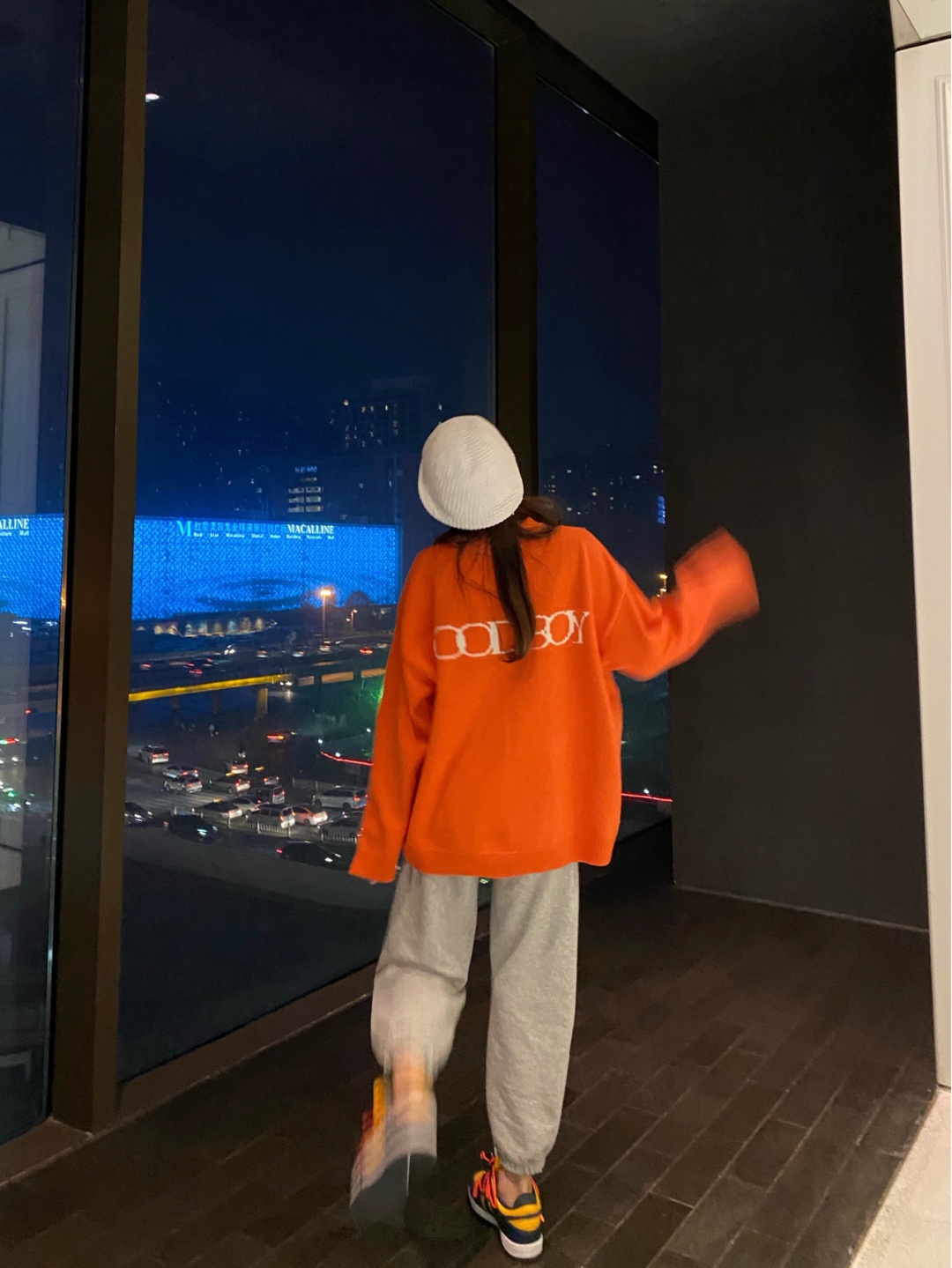 今天是穿了橘色字母毛衣的小橘子🍊,橘色的大底搭配上白色的字母,前面还有一个蓝白的小标,搭配灰色运动裤,然后再搭上她们家的白色毛线帽🧵感觉自己就是个时尚弄潮哈哈哈