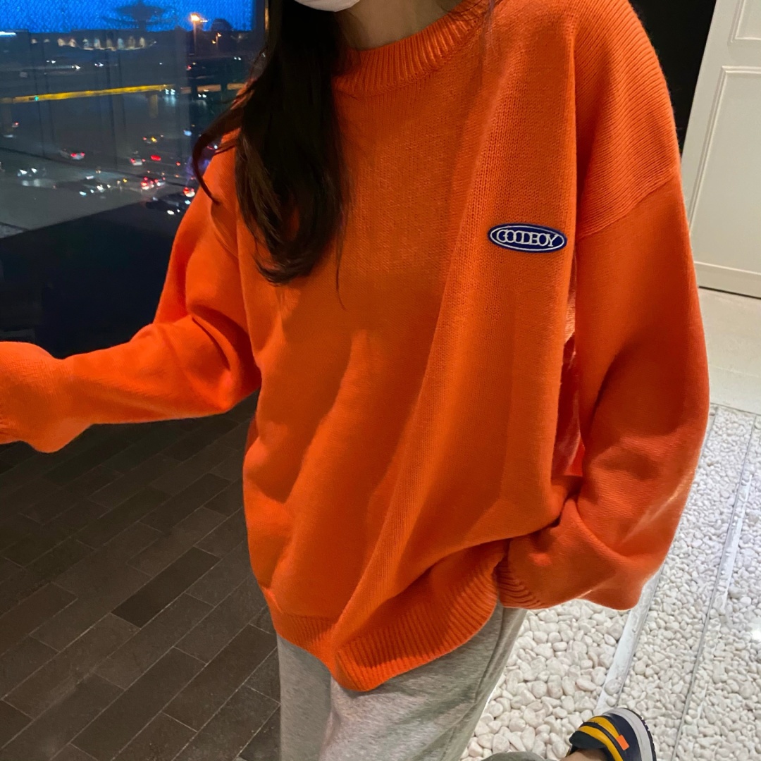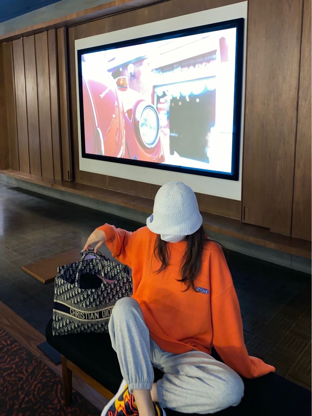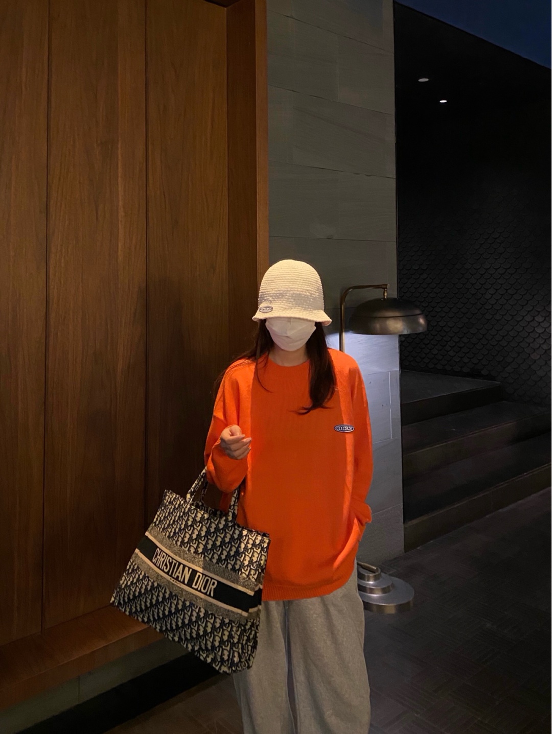 今天是穿了橘色字母毛衣的小橘子🍊,橘色的大底搭配上白色的字母,前面还有一个蓝白的小标,搭配灰色运动裤,然后再搭上她们家的白色毛线帽🧵感觉自己就是个时尚弄潮哈哈哈