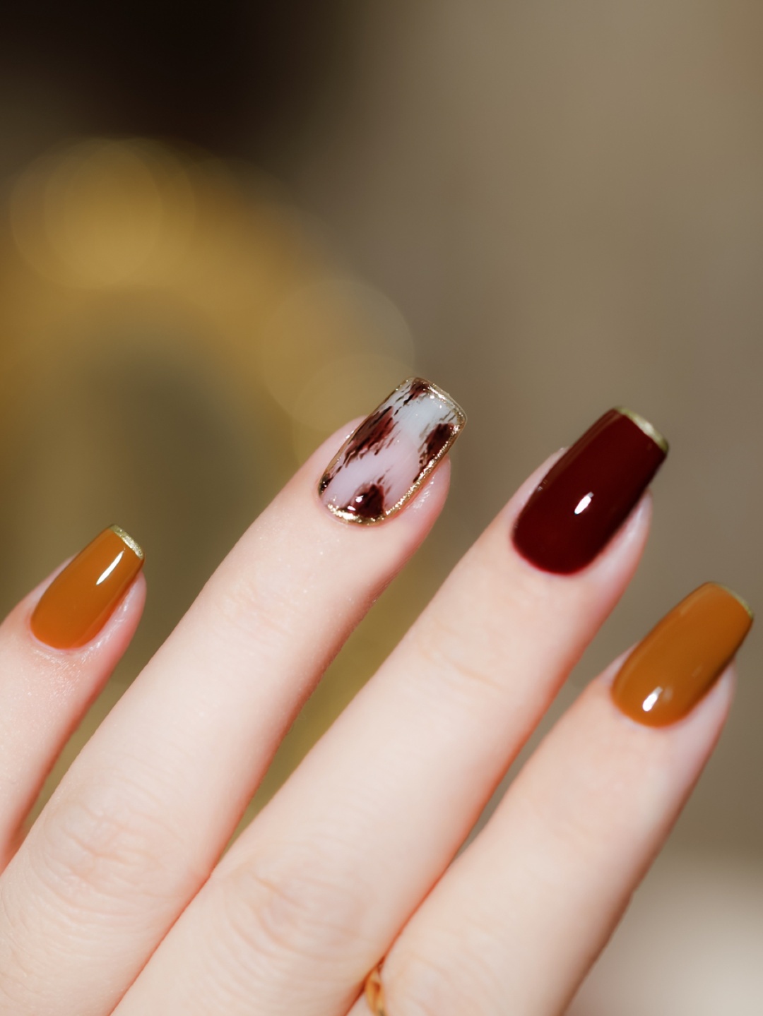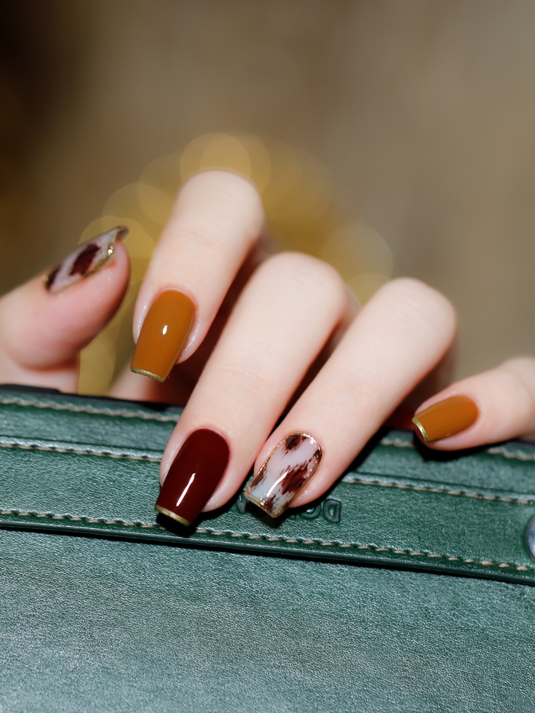 🍂中指涂的枫叶棕🍁13号涂满甲画上金属质感边边 完美