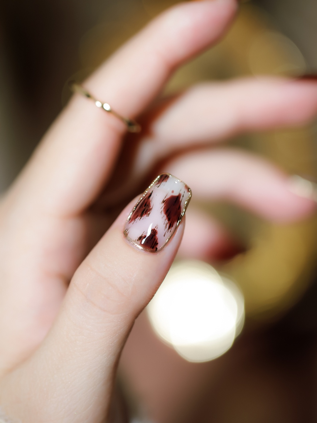 🍂大拇指 无名指 取枫叶棕10号色 画豹纹这个颜色比中指要巧克力🍫些画豹纹好看腻 照灯后取彩绘胶黑色画上丝丝 再溜个魔镜粉边边