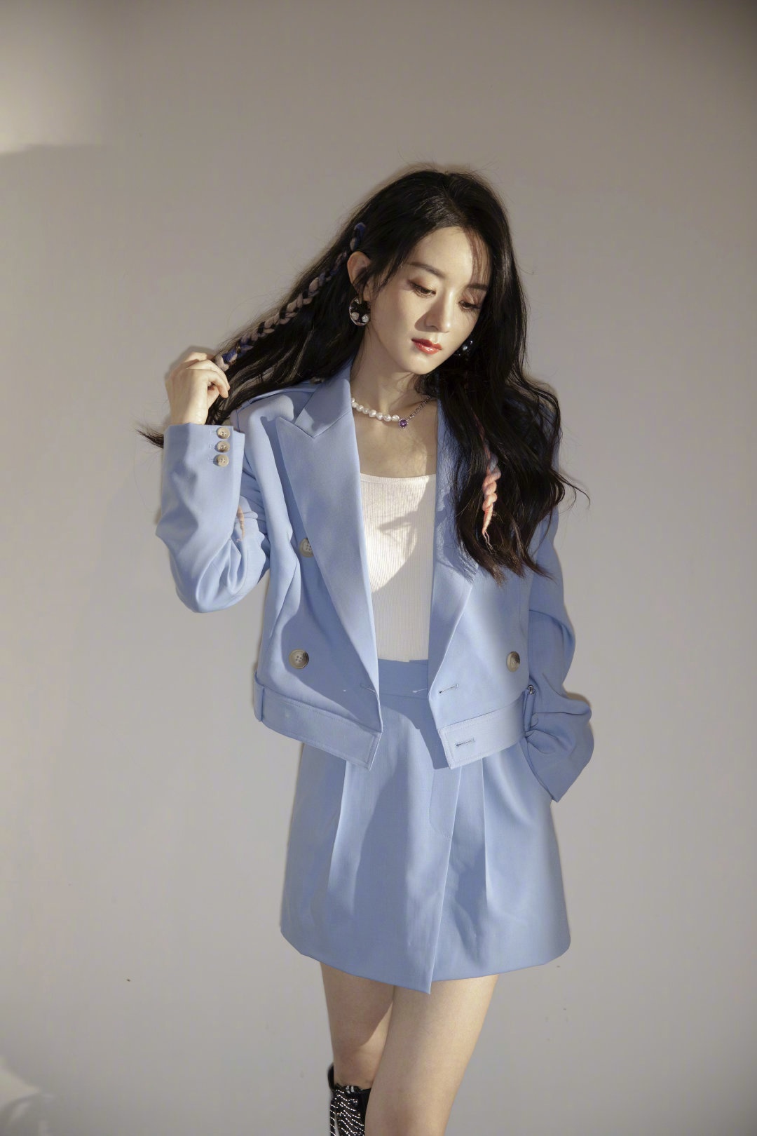 赵丽颖粉蓝编发配皮质长靴亮相,酷帅风来袭。