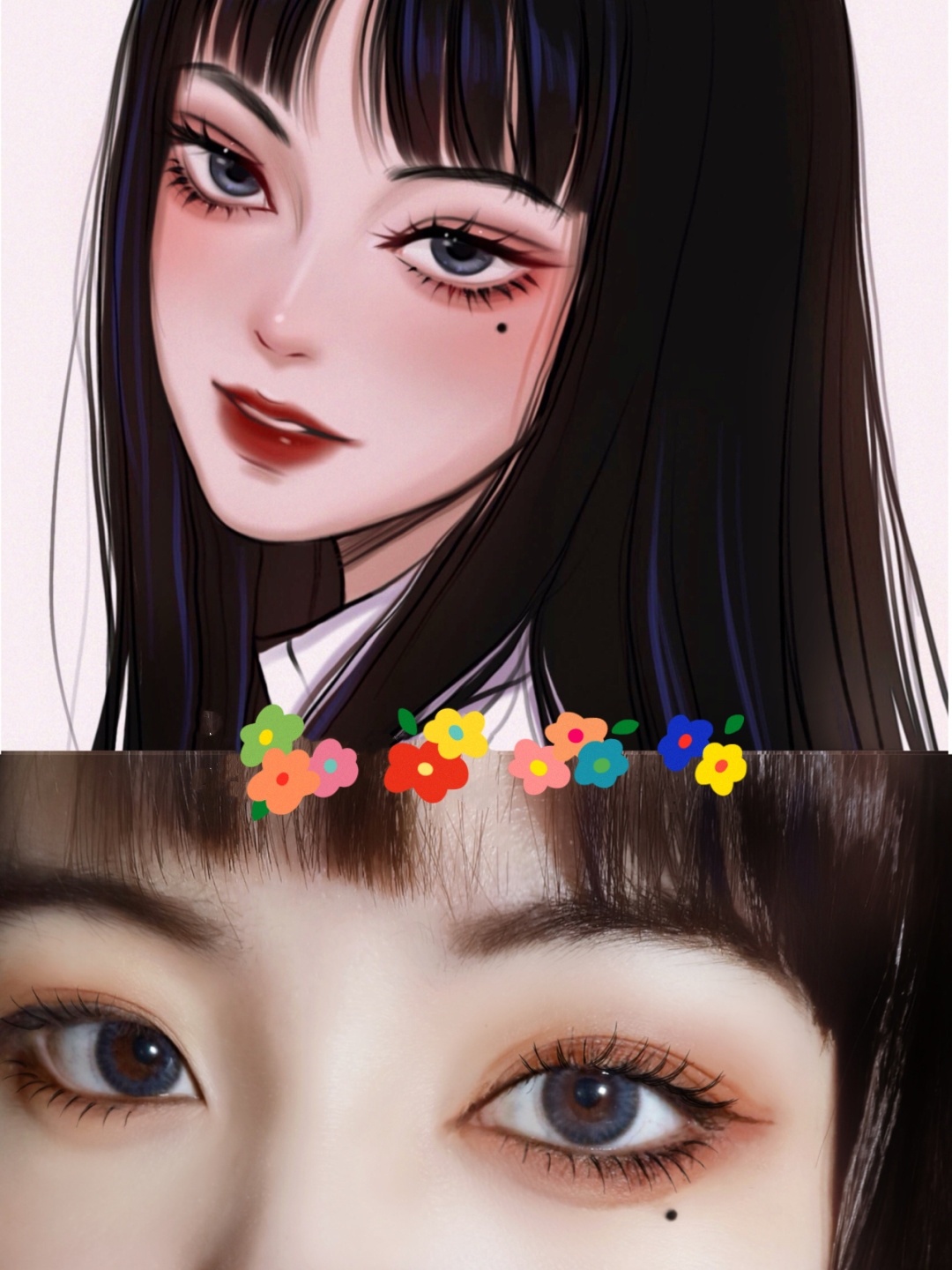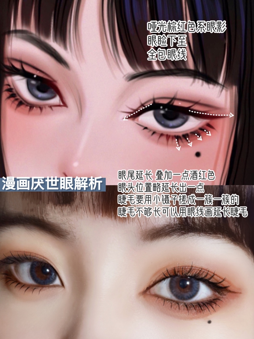 4Tips:黑长直发,细眉毛全包眼线长且浓睫毛哑光棕红色系眼影眼睑下至眼角点痣