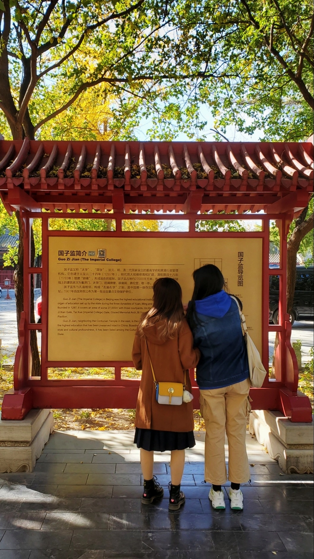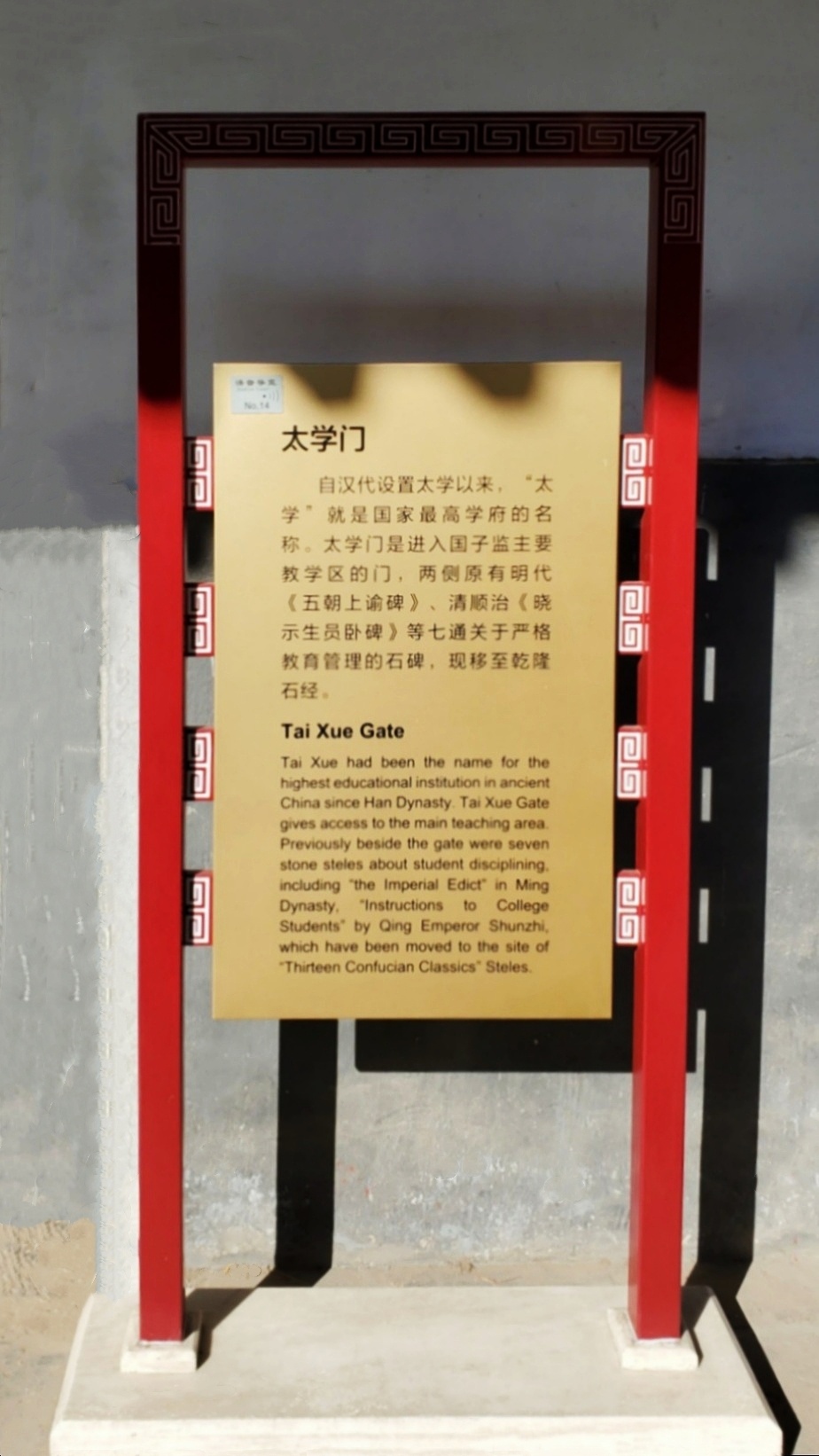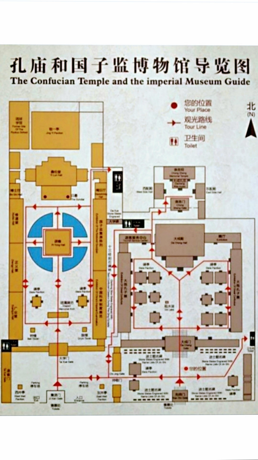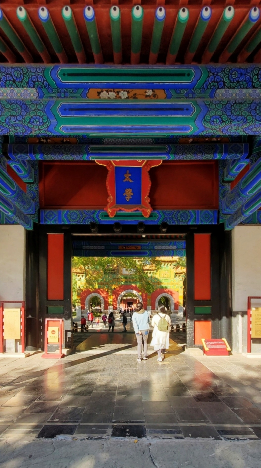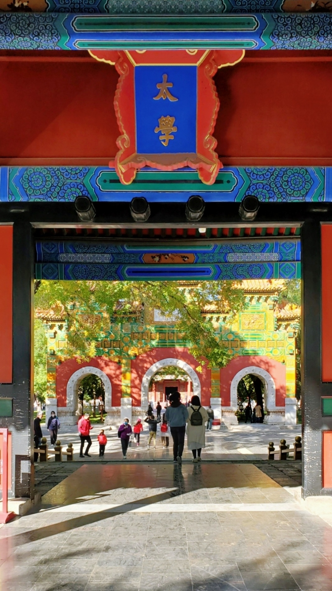 从图一的导游图可以看出,左侧黄色部分为国子监,右侧灰土色部分是孔庙。虽然它们各有其大门,但门票只有一张。也就是说,里面有一座门把它们连在一起,从孔庙经过此门,就来到了国子监。国子监或国子学,是在中国古代封建社会的教育管理机构和最高学府。其具备了两种功能,一是国家管理机关的功能,二是国家最高学府的功能。除了正门,太学门是进入北京国子监的最后一道大门。古时候将国子监称为太学、国学,当年的太学是国家办的唯一的中央大学。“太学”一词源于三千多年前,那时就有了以“太学”为名的学校,到了两千多年前的汉武帝时,已创立了我国封建社会第一所中央官办大学“太学”,从此太学成为国家最高学府的名称,一直延用至清末。