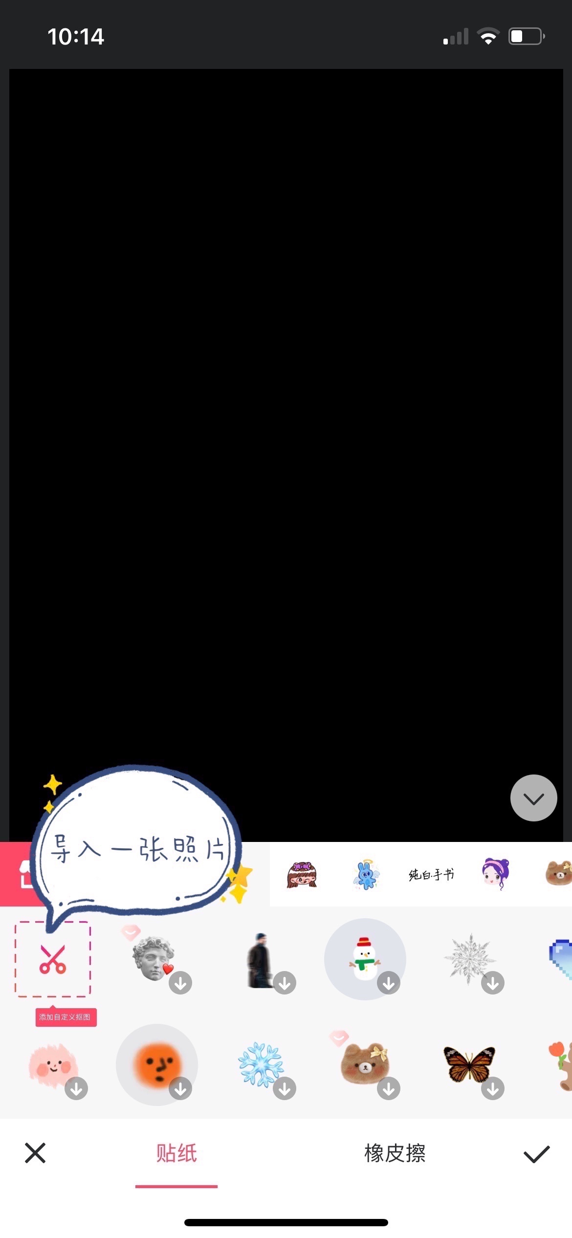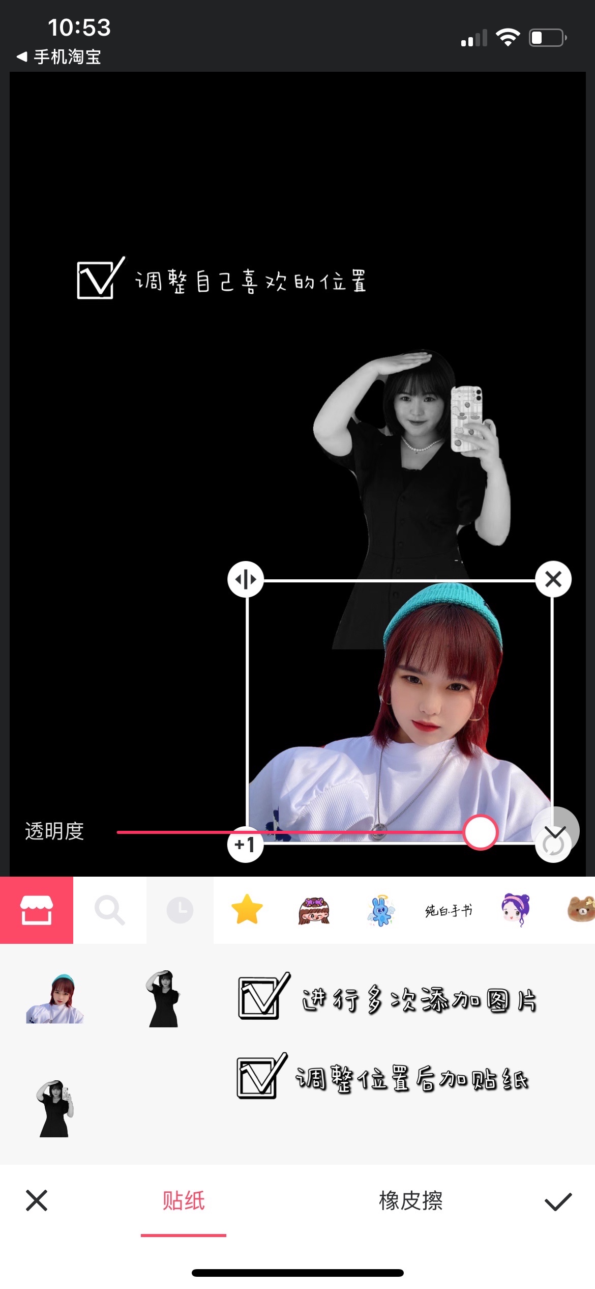 【第三步】将导入的多张图片裁剪成贴纸后,调整成自己喜欢的位置,最后加入自己喜欢的贴纸~或者涂鸦笔写字✍~马赛克特效~总之喜欢什么加什么就行了~