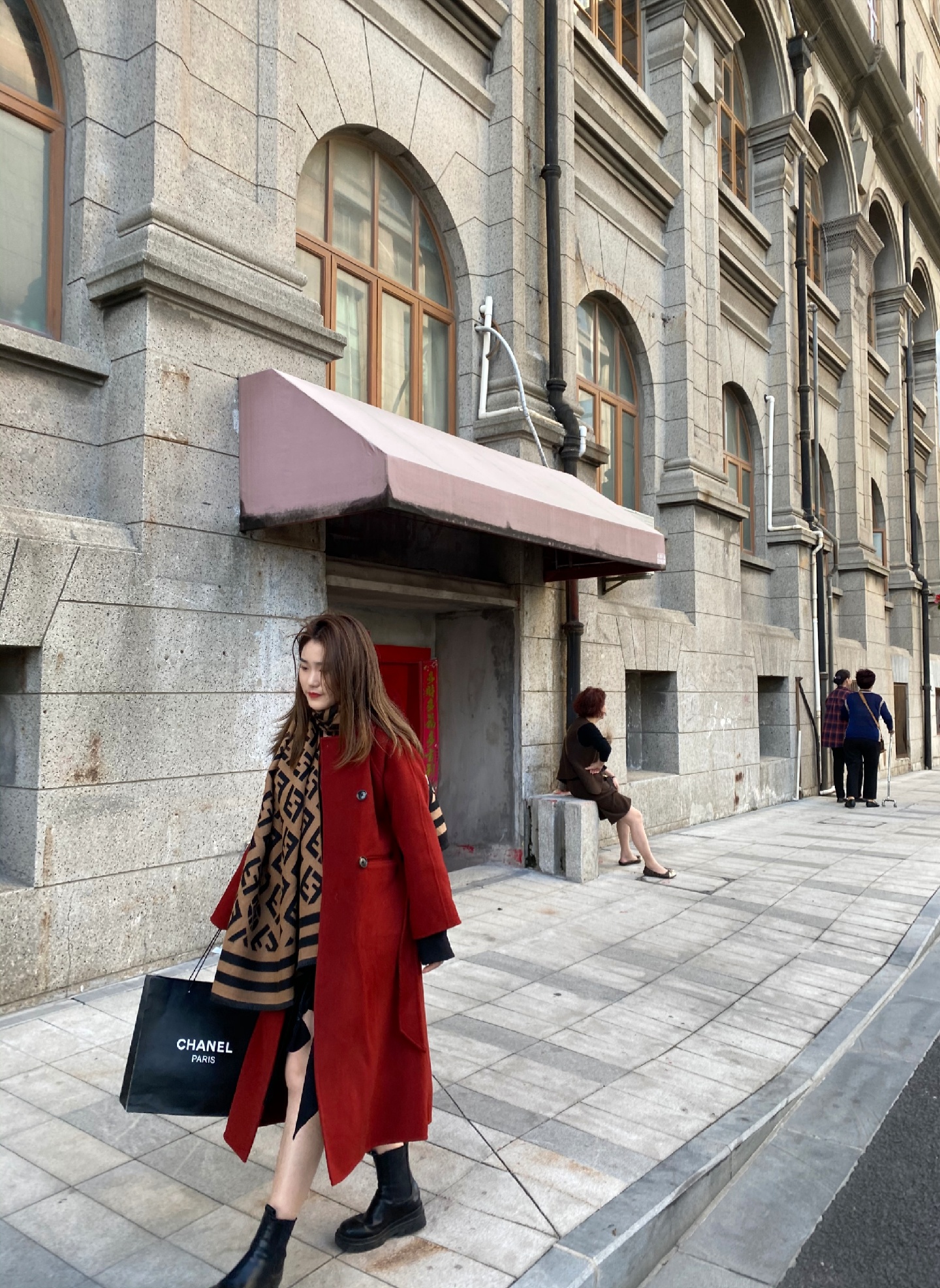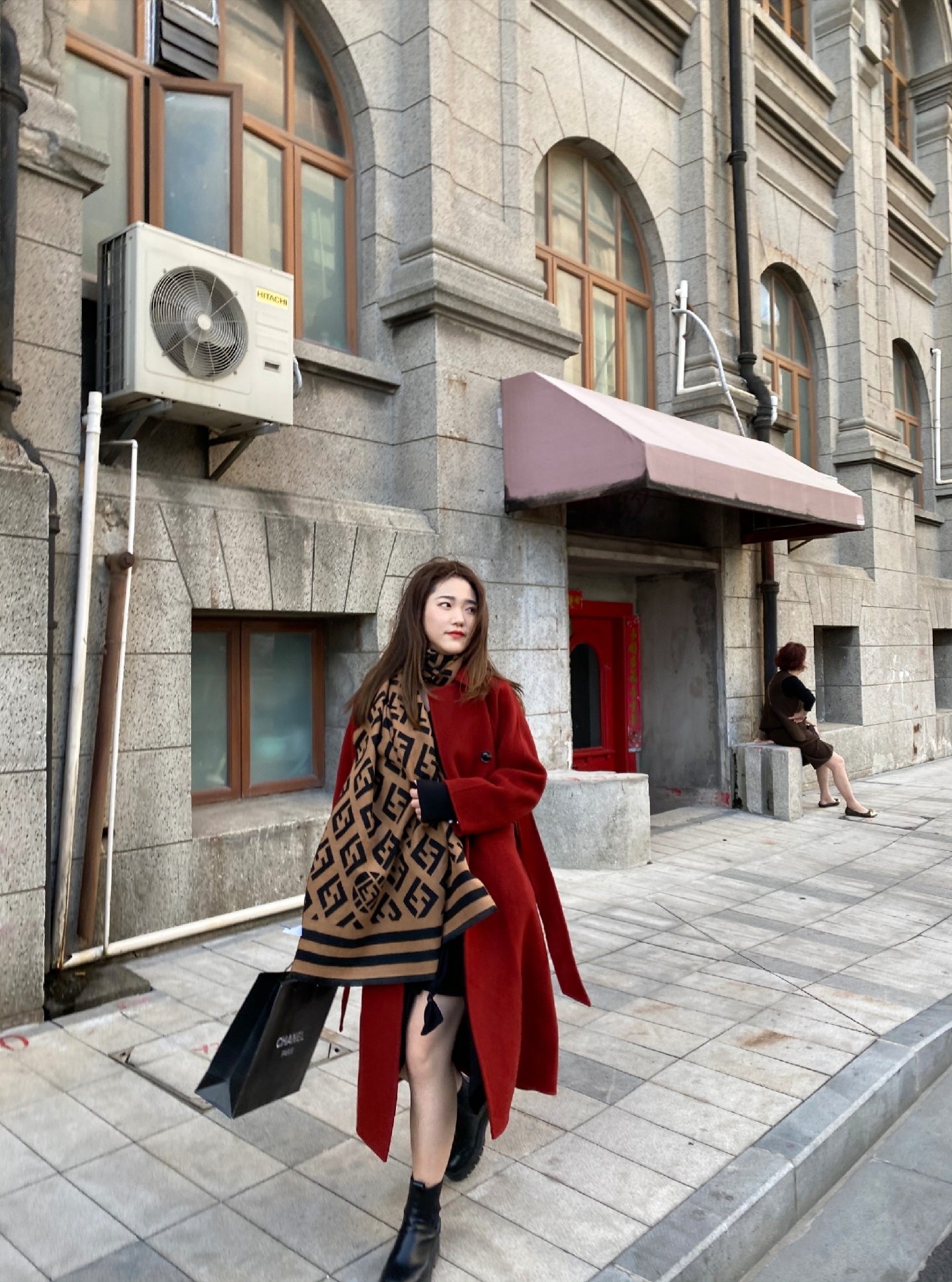 红色的双面呢搭配芬迪撞色围巾,是不是有了明星街拍的感觉😎角度倾斜拍出延伸感瞬间给人一种高大上的视觉冲撞。