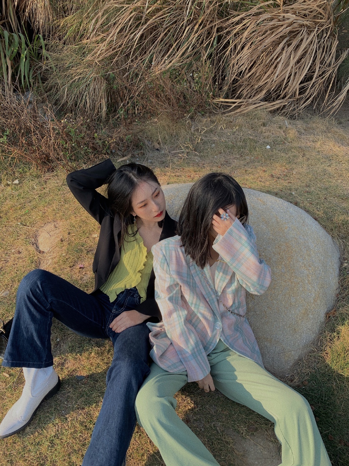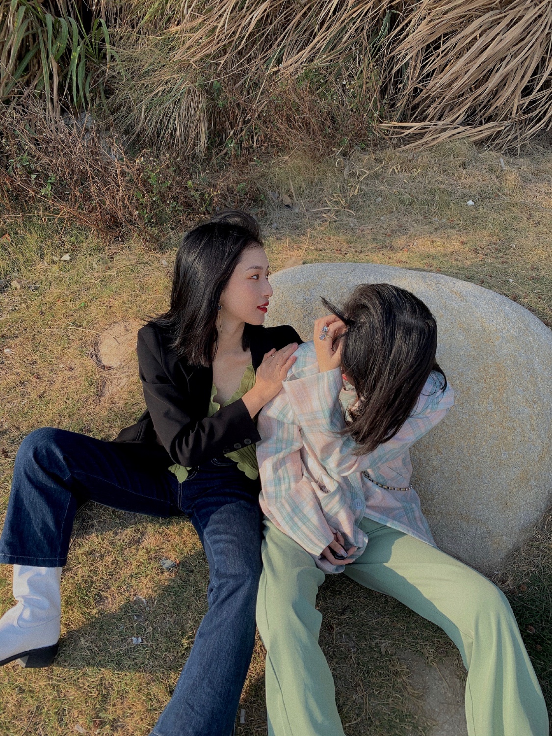 2️⃣带上蓝牙三脚架 跟姐妹一起坐在草地上合拍 不用看镜头 撩头发或者假装看姐妹