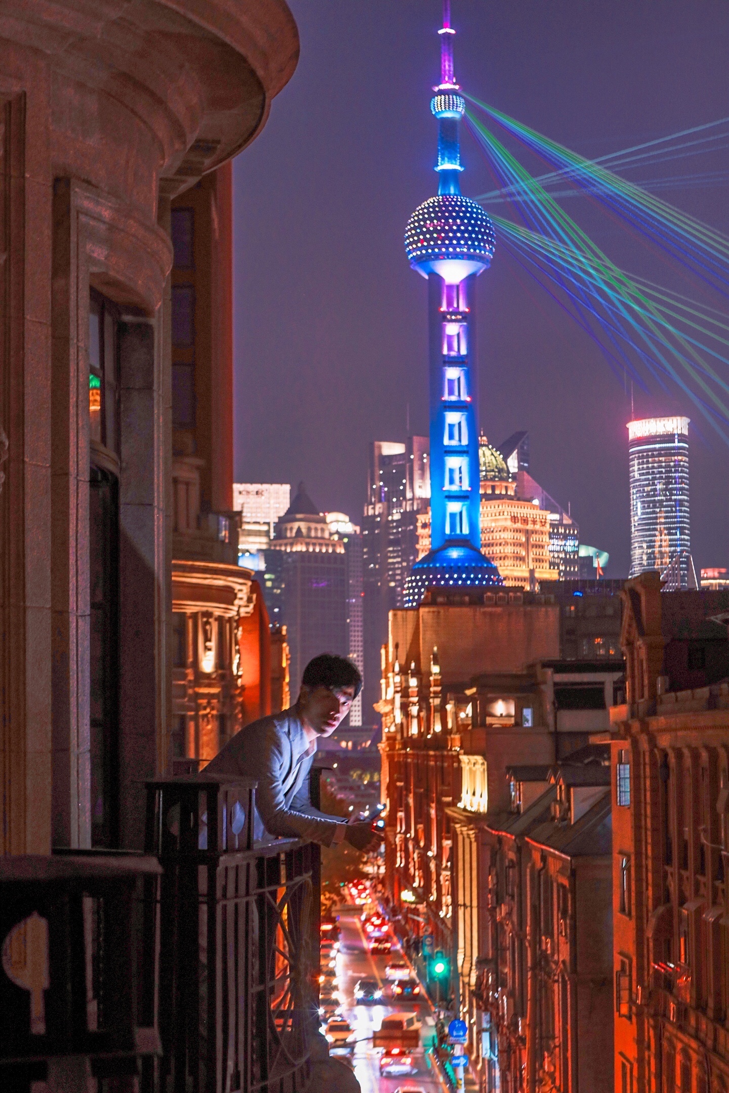 图2在五楼转角阳台,真巧遇上进博会灯光秀,灯光秀从20点~22点,每半小时一波