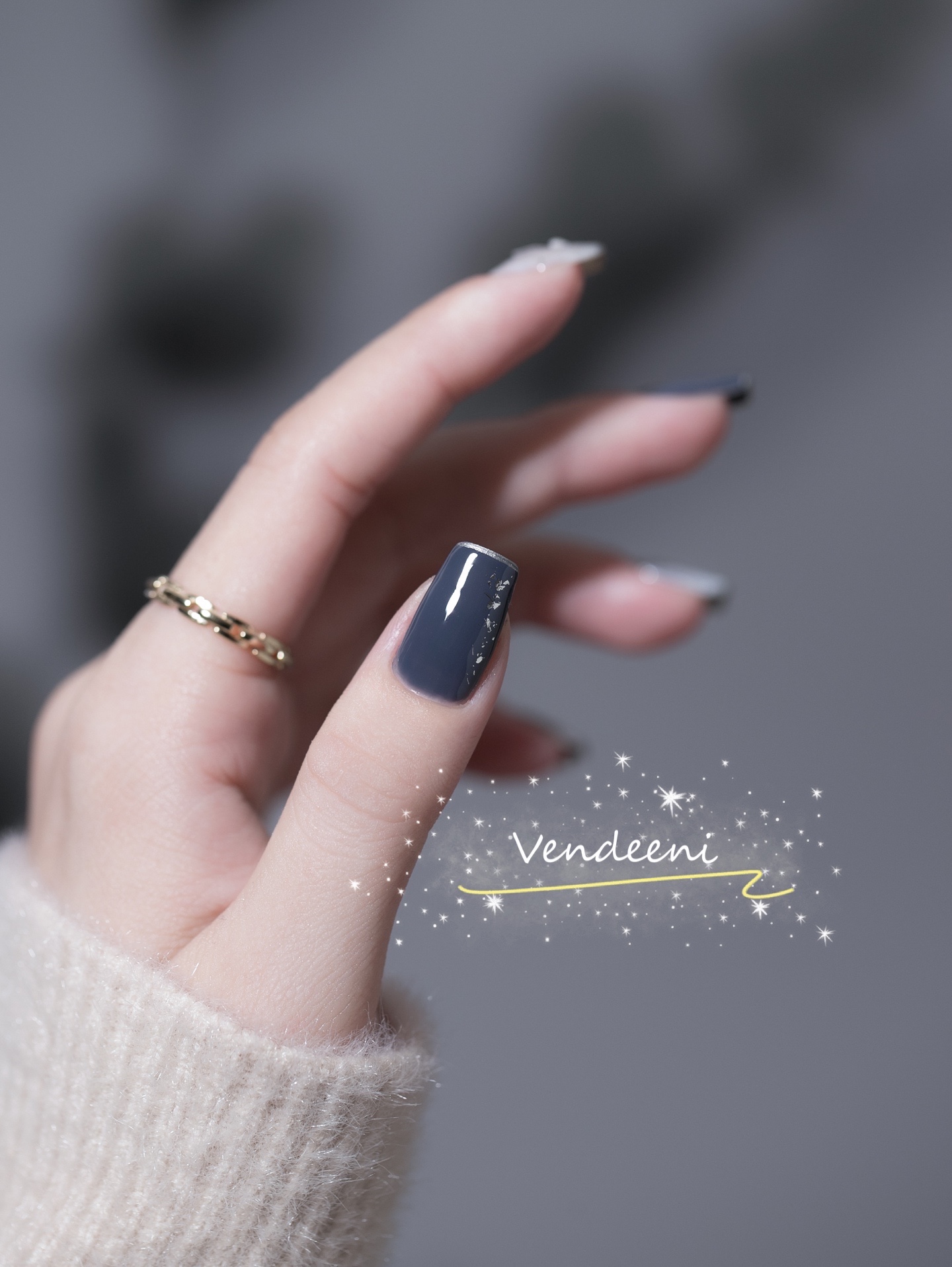🍁无名指涂满17还奶白蓝色在拿笔取中指的雾霾蓝色在甲侧面轻轻扫一下粘点银箔完成喔