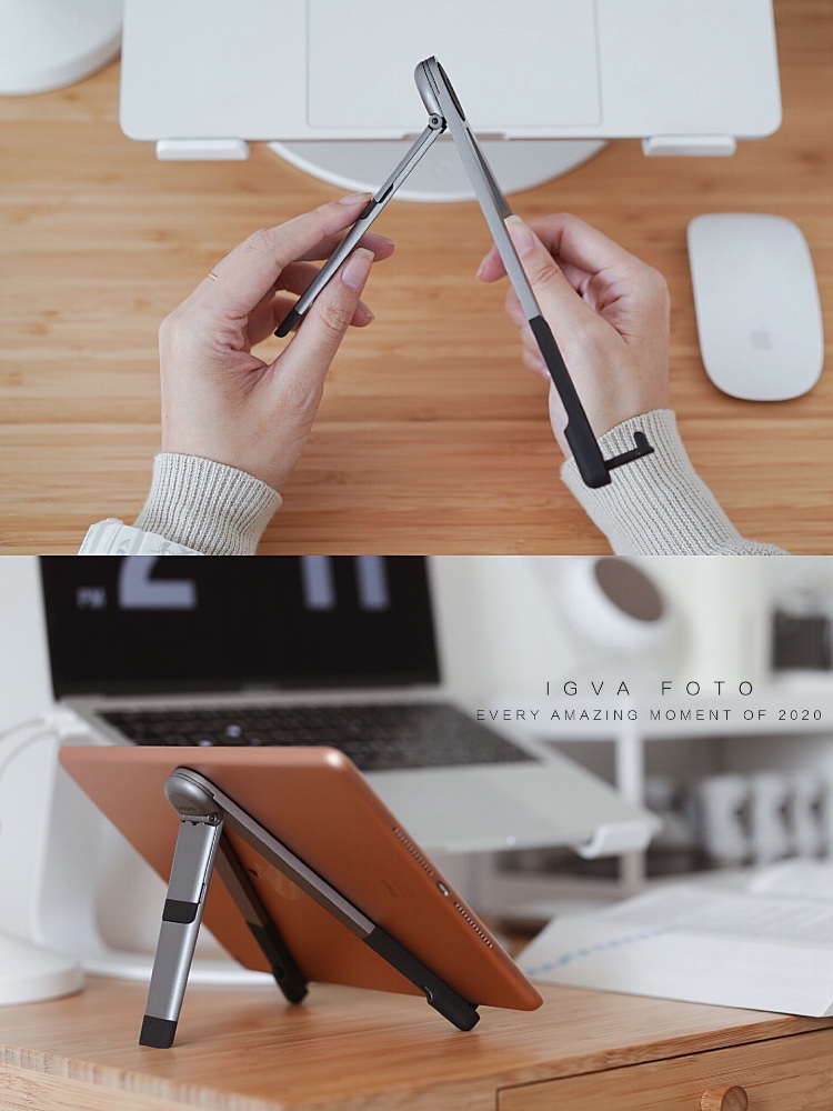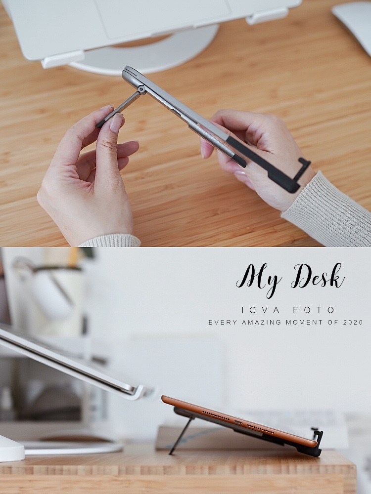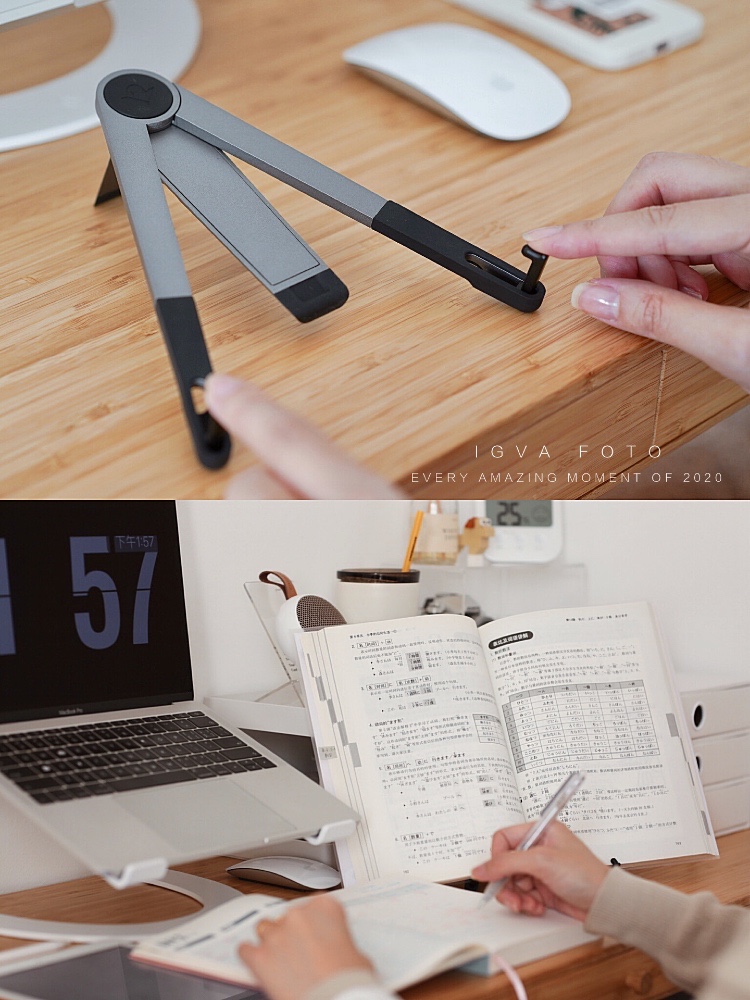 ▪️前面说了,我的书桌不大,而这个电脑支架小巧可折叠,不用的时候可以收起来,外出带着也方便。支架的质感很棒,是进口钢材、很结实,三脚支撑也很稳固。