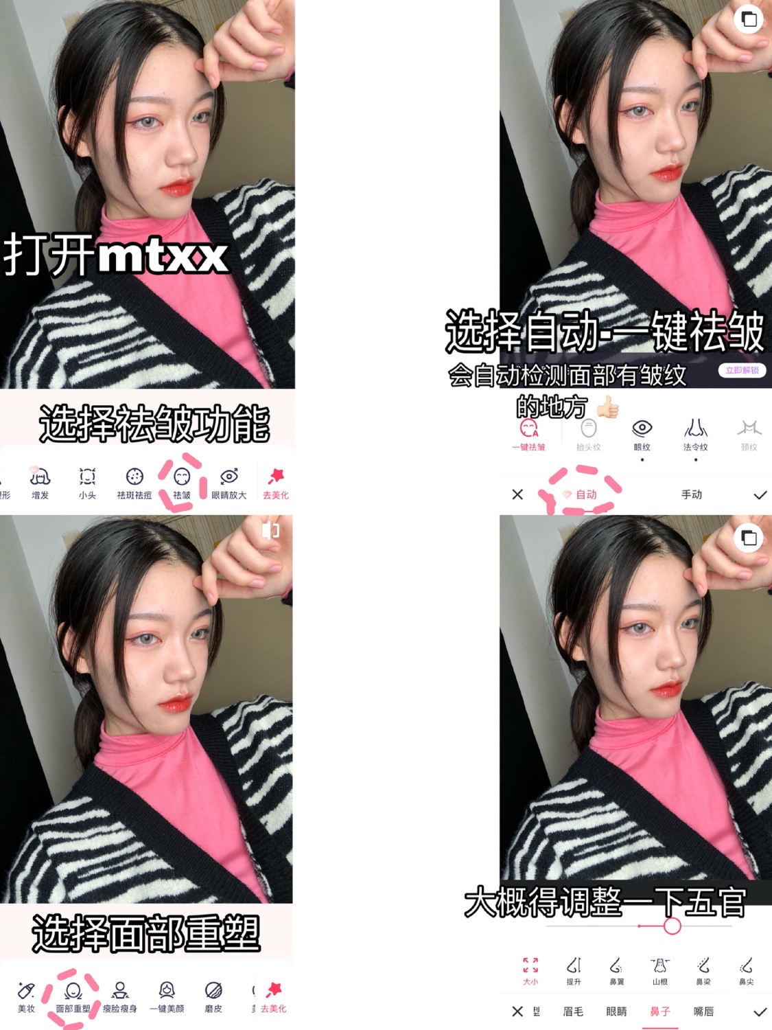 1️⃣我会先用祛皱这一步 美图秀秀新出的自动去除功能真的很好使 真是熨斗级去皱了!!以往是需要手动调整的 效果不如现在的一件去除来的好~