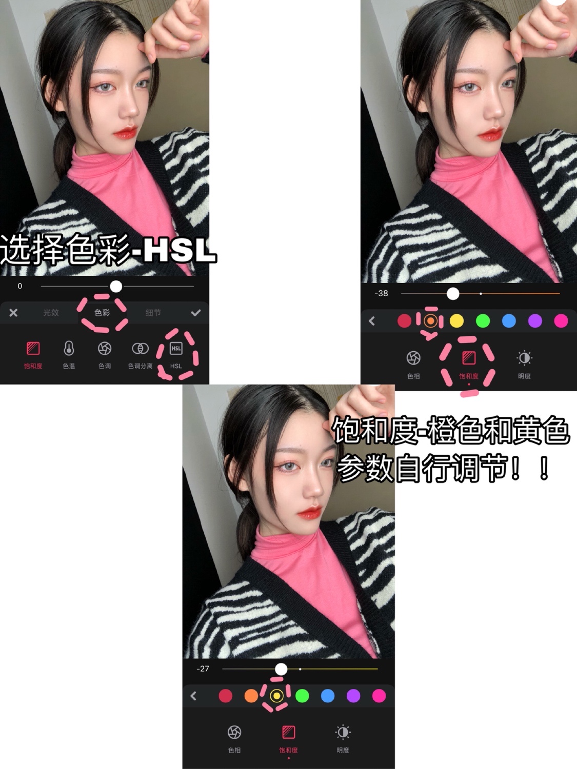 9️⃣去美化-调色-色彩-HSL-饱和度调整一下橙色和黄色 参数自行调节 这一步可以变冷白皮喔