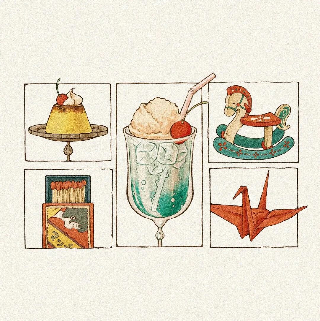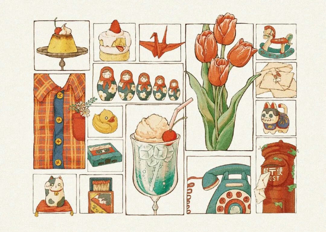 她的很多作品只画了局部,但是所画的这些小局部,都很有细节,配色看起来特别舒服~个人很喜欢这类,有温馨感,治愈感的手绘~💕