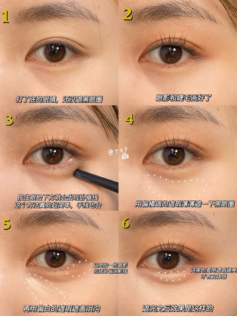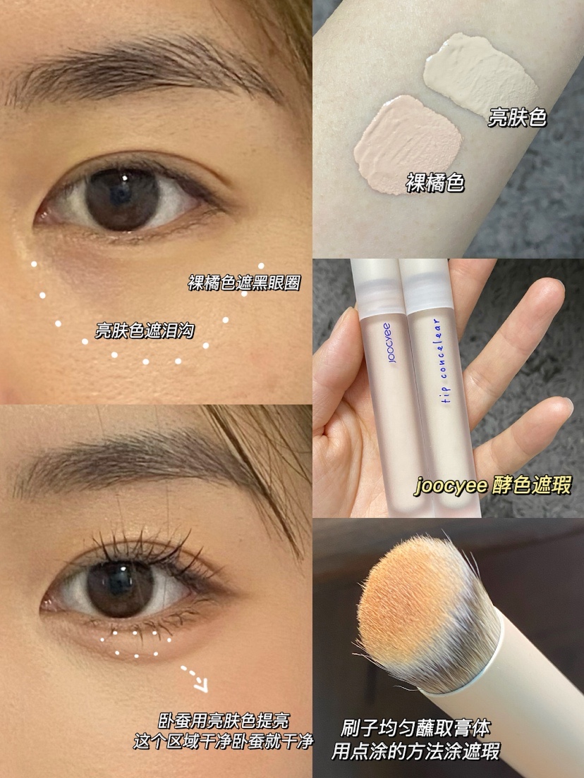 之前有姐妹想看泪沟怎么遮,看图3⃣️吧。先画出卧蚕,再用偏橘色的遮瑕遮黑眼圈,因为泪沟这里是凹陷下去的,所以要再用一个亮色的遮瑕局部遮泪沟这里。涂遮瑕的时候用面积大一点的刷子更好,参考图4⃣️,用点涂的方法遮盖力就很好。记住卧蚕中间也要用遮瑕提亮哦,之前的卧蚕视频笔记里也是用的这个方法。画出来的卧蚕才会很立体。