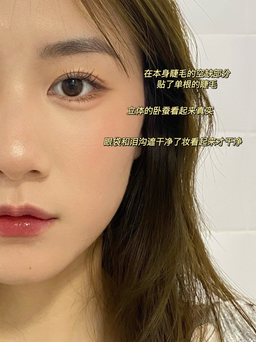 初恋感妆容就是要清透啦,比伪素颜再多一点。眼妆是重点,睫毛要处理的根根分明,我在睫毛的空缺部分贴了几根单根的仙子睫毛,很自然,面对面几乎看不出来,嘿嘿。没有刻意涂眼影,用腮红扫了一下就好啦,下眼影可以重一点,后眼尾衔接卧蚕阴影线,看起来就很自然