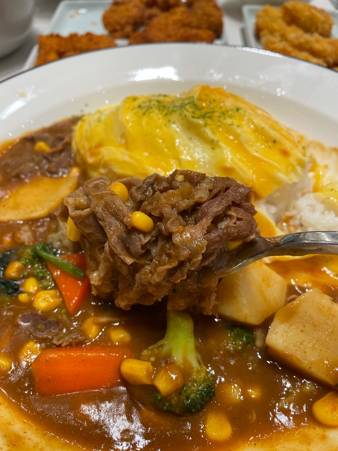 一勺米饭配上咖喱滑蛋和炸鸡🔥一定要一口放进嘴里才满足👅