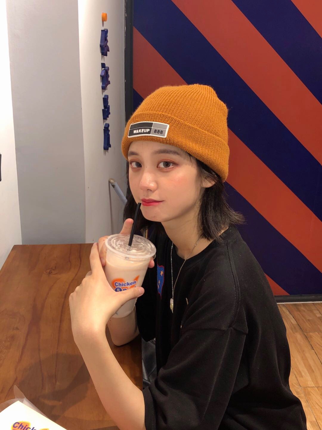 今天不想打理头发就戴了帽子,🧢拍照的时候就假装整理帽子再看镜头,手边有奶茶🥤之类的道具是最好拍的了,拿起来不经意的看下镜头就很自然了