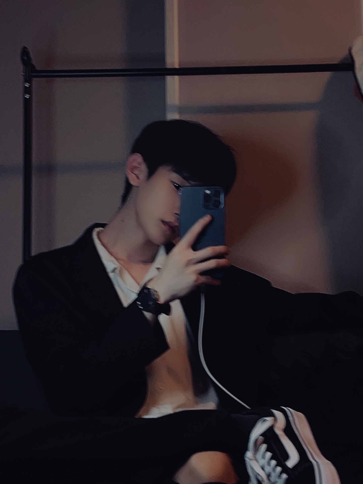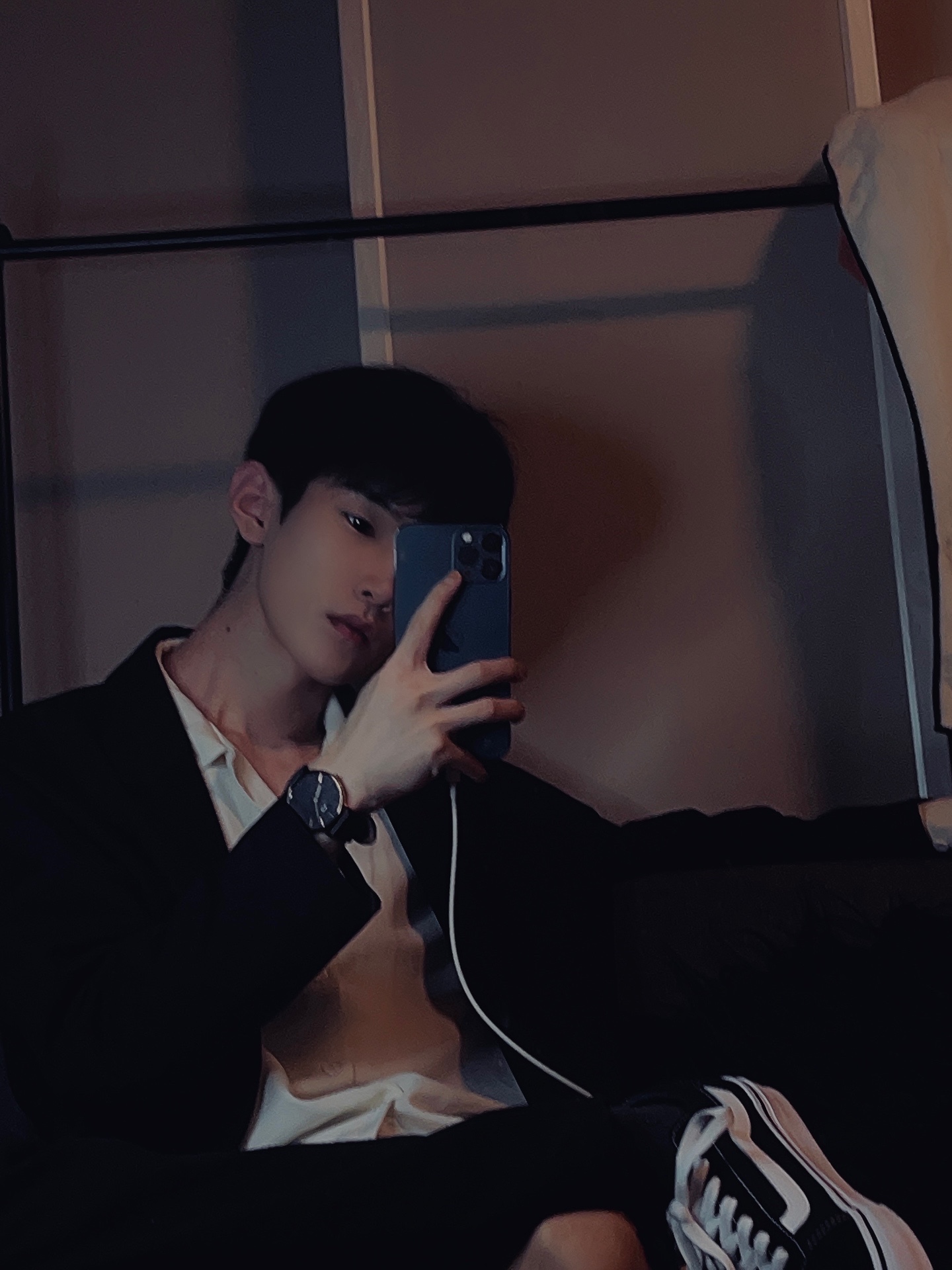🆗找一个镜子,对镜拍,手机遮挡半张脸露出迩认为最好看的半张脸,靠坐在沙发上,灯光调暗侧打。带有点影子的感觉。这样就可以啦。
