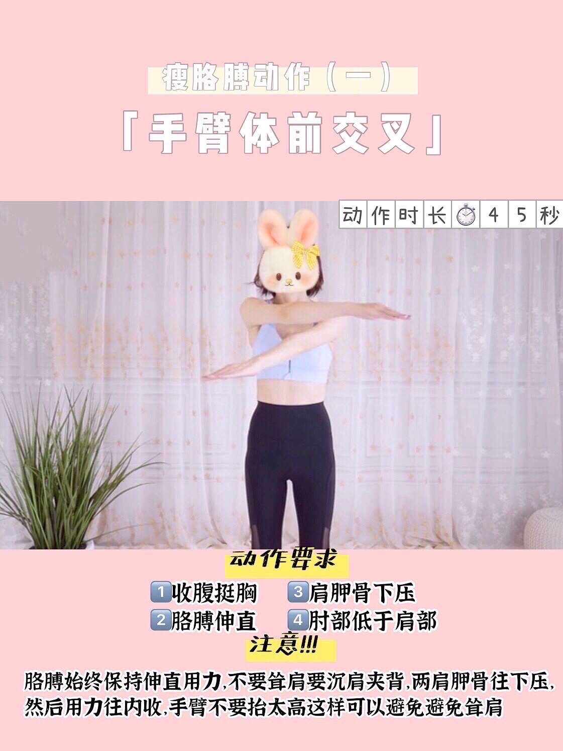 手臂体交叉要注意收腹挺胸,胳膊伸直并且保持用力,不要耸肩要沉肩夹背,也就是说两肩胛骨下压,然后用力往内收紧,注意手臂不要抬太高肘部要低于肩膀,这样可以很好的避免耸肩。