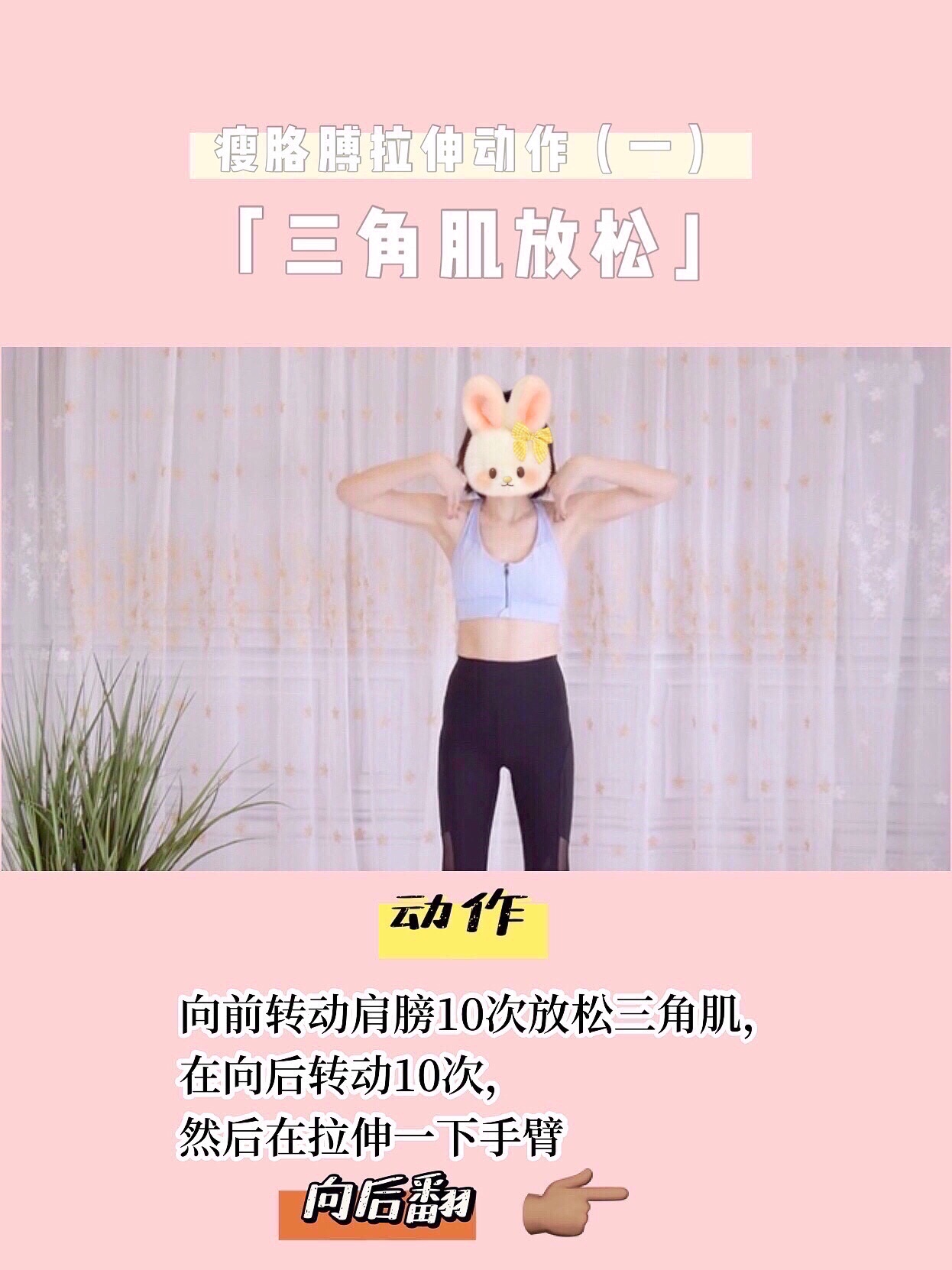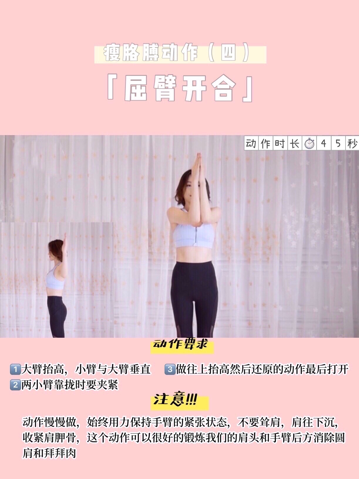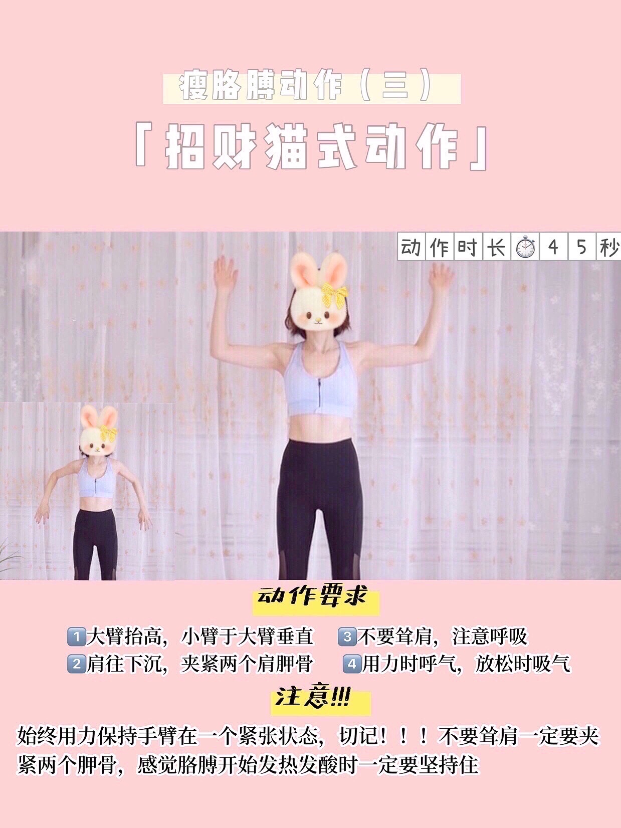 注意招财猫动作大臂要抬高一点,小臂于大臂垂直,始终用力保持手臂的一个紧张状态,不要耸肩肩往下沉夹紧两肩胛骨,注意呼吸用力时呼气,放松时吸气,感觉胳膊发酸了吗?坚持住💪