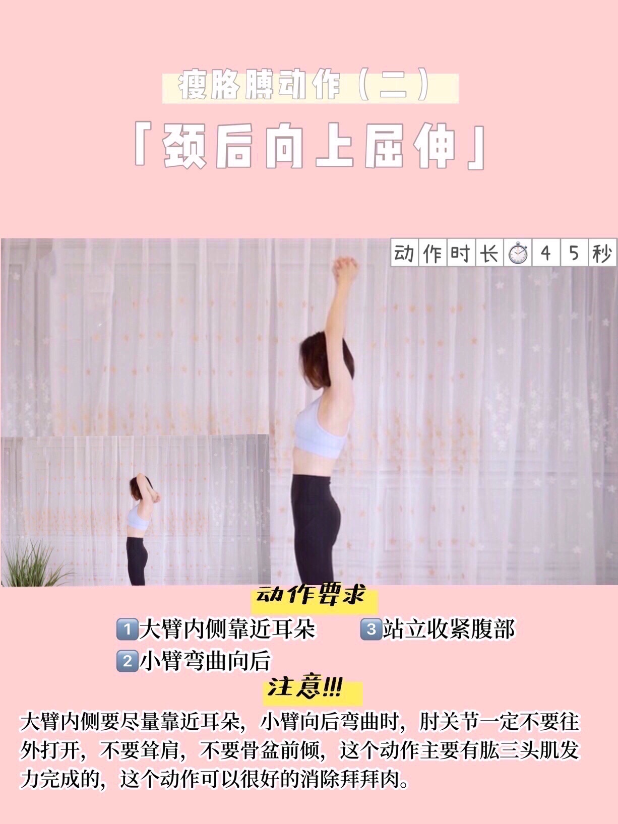 颈后向上屈伸大臂内侧要尽可能的靠近耳朵,尤其是小臂向后弯曲的时候,一定要把肘关节往外打开也不要耸肩,注意站立时要收紧腹部,不要骨盆前倾这个动作主要由肱三头肌发力来完成的,我们的拜拜肉就是因为手臂后方这一块肱三头肌长期得不到充分的锻炼而完成的肌肉萎缩和脂肪堆积,所以这个动作可以很好的消除拜拜肉,夏天告别蝴蝶袖,所以我们要把动作做到位了,加油💪