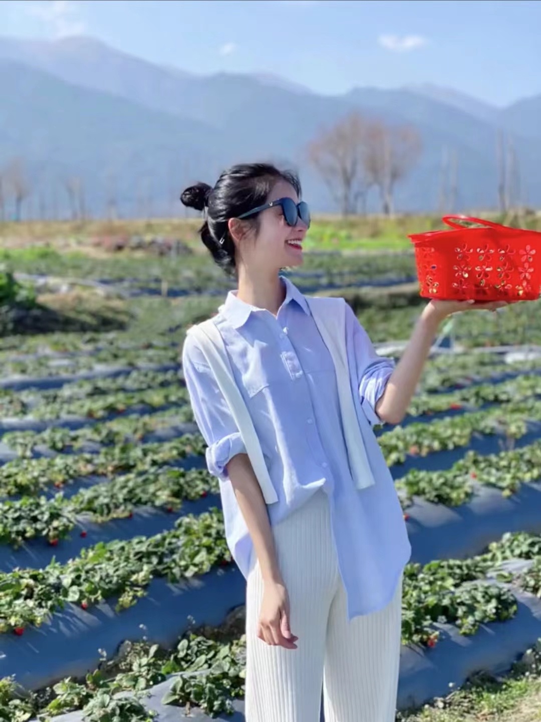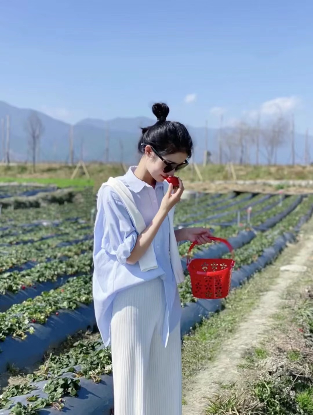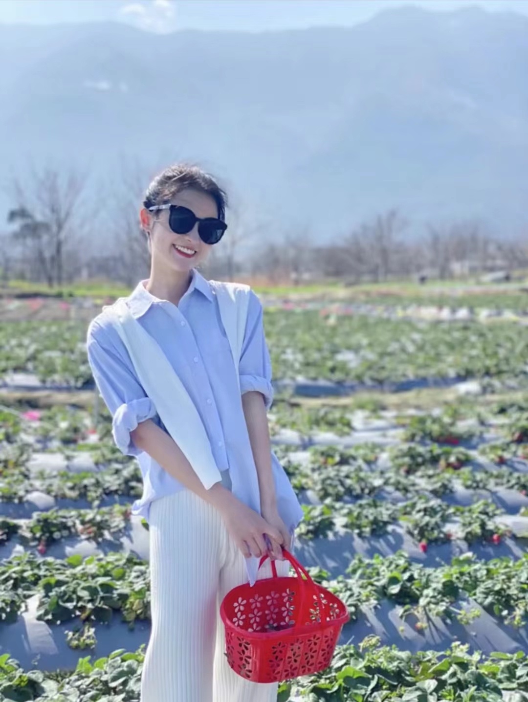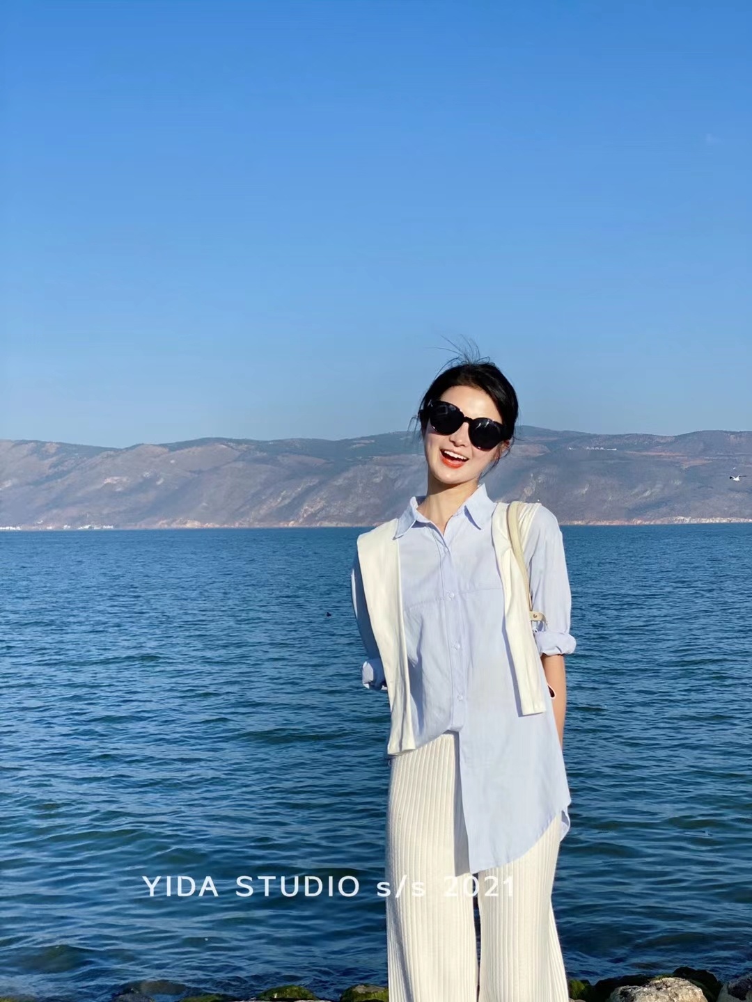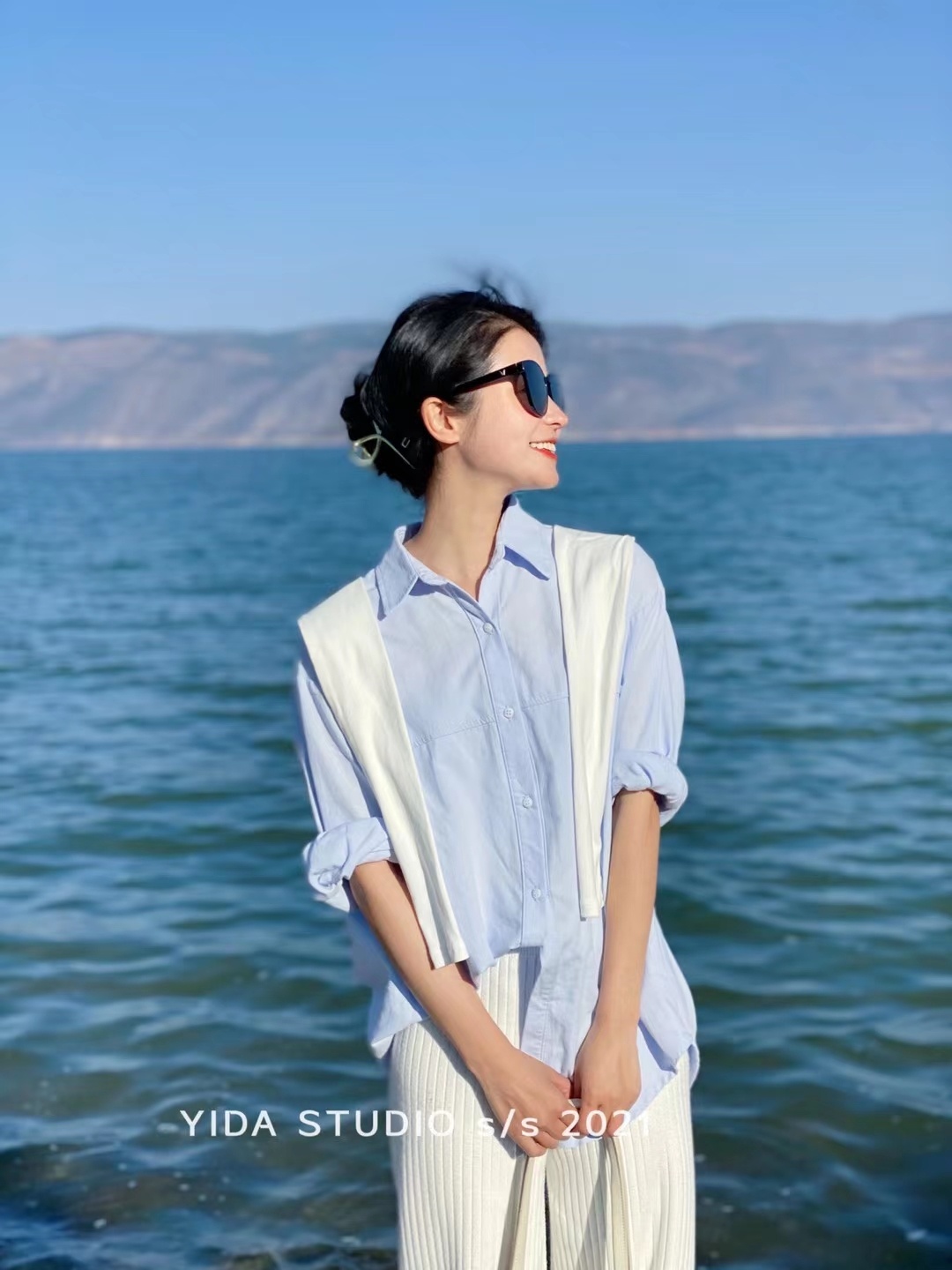 蓝色衬衫送披肩