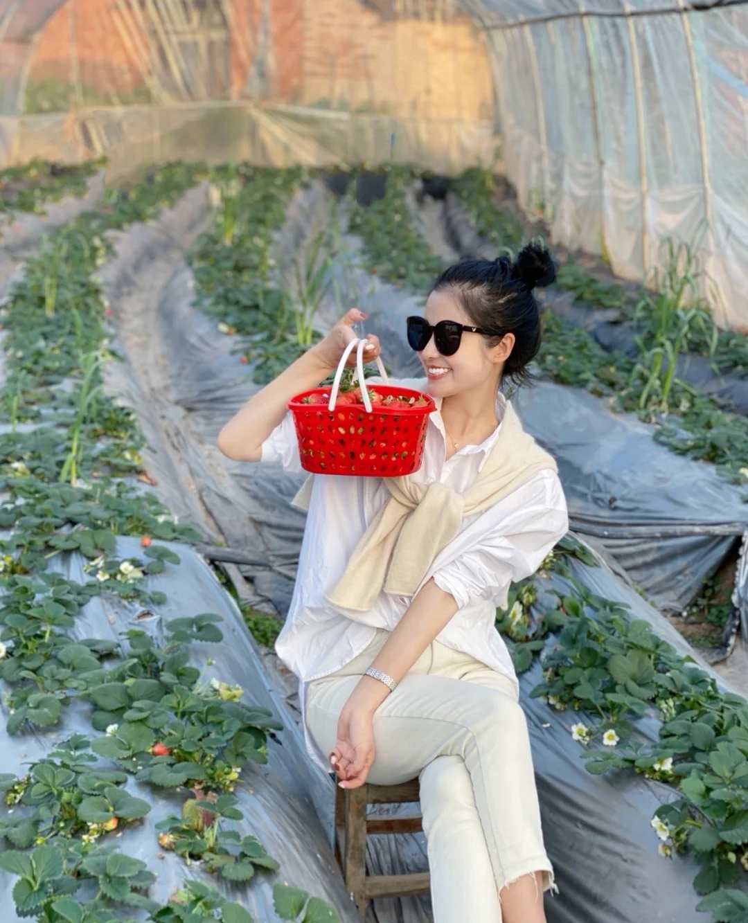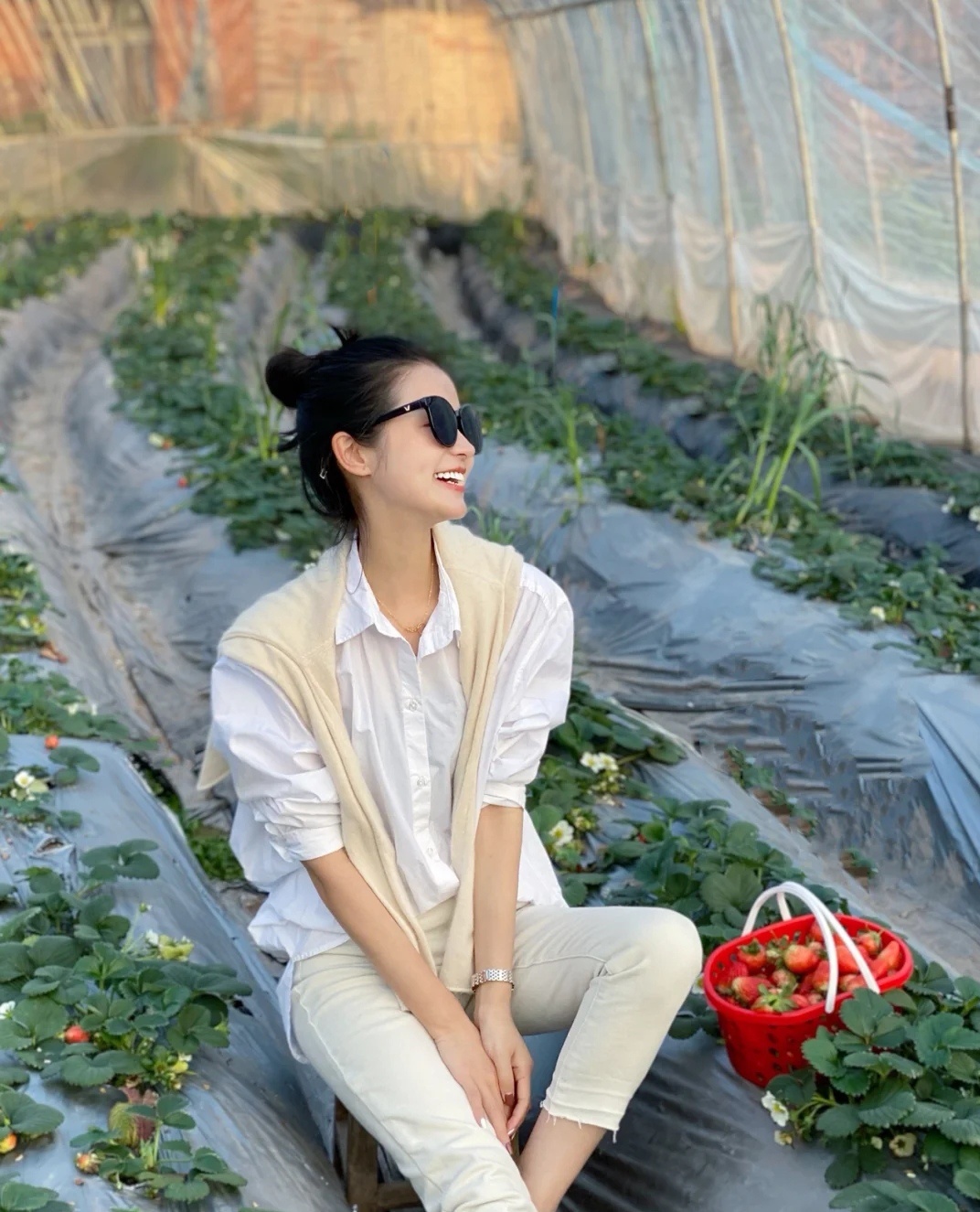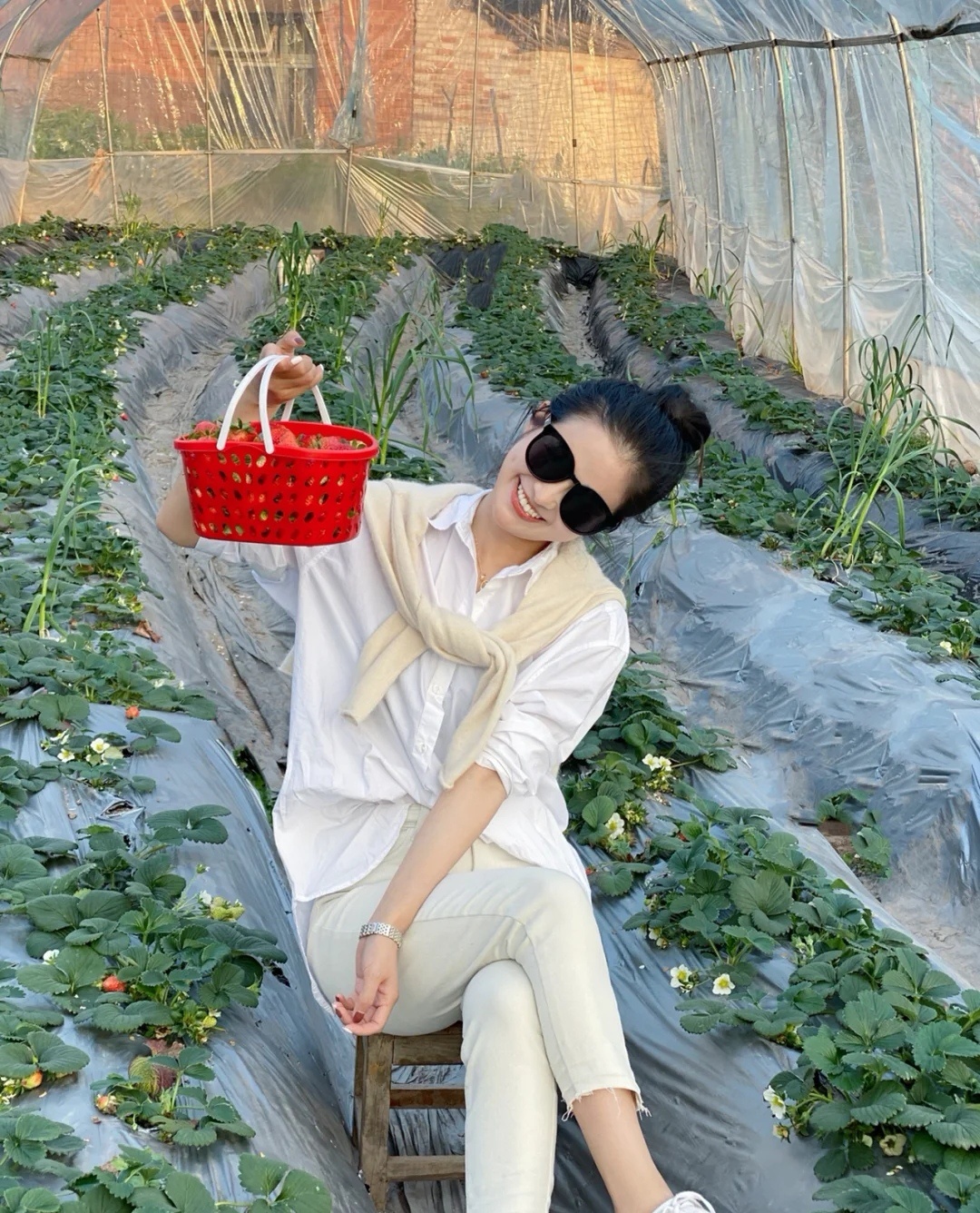 白色衬衫+黄色披肩+杏色牛仔裤