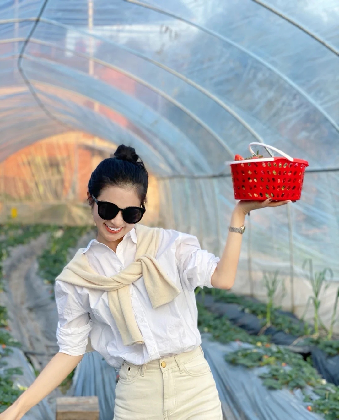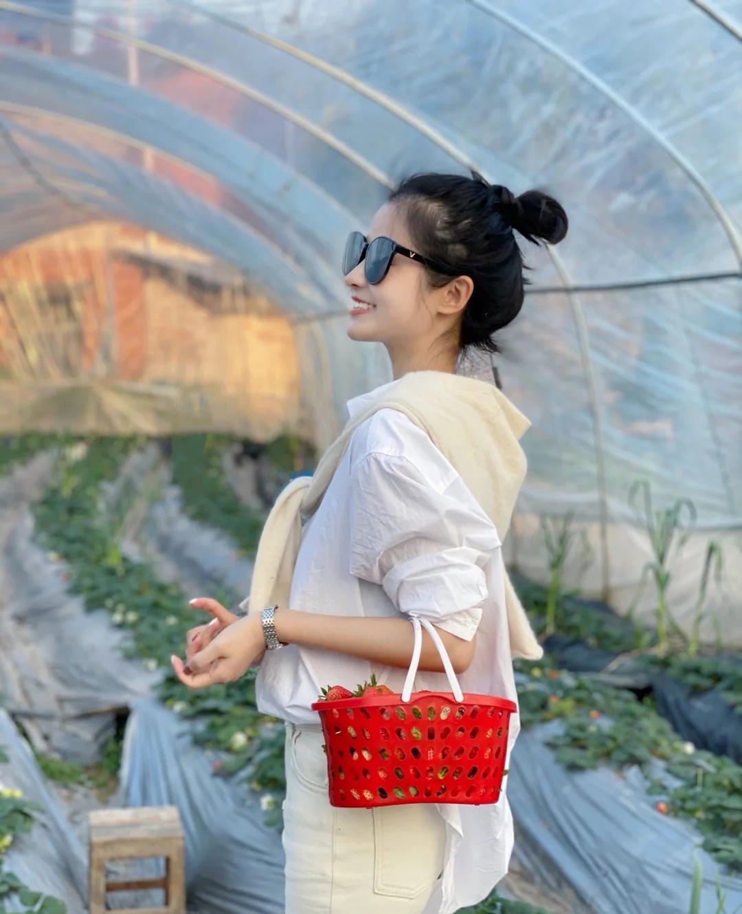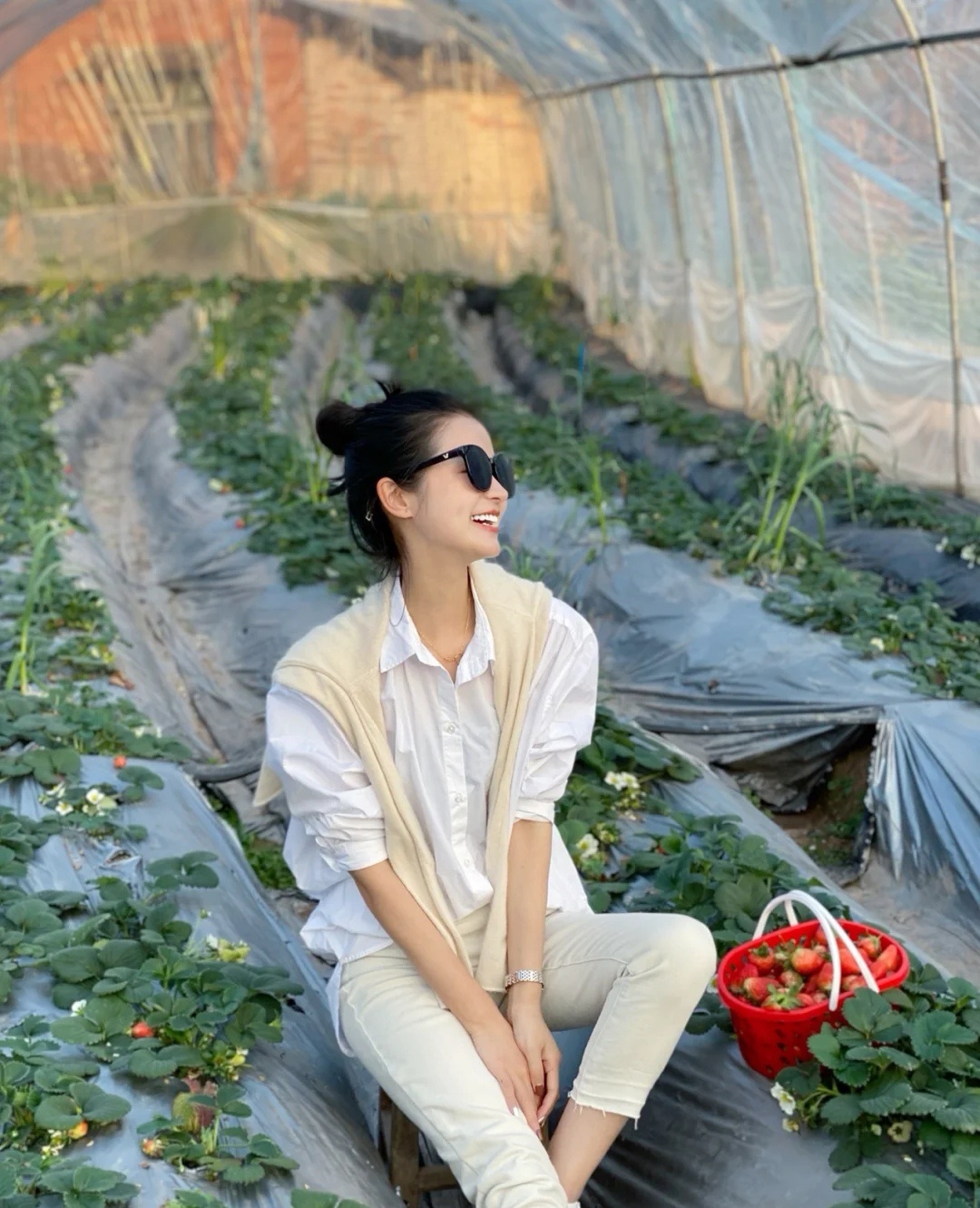 白色衬衫+黄色披肩+杏色牛仔裤