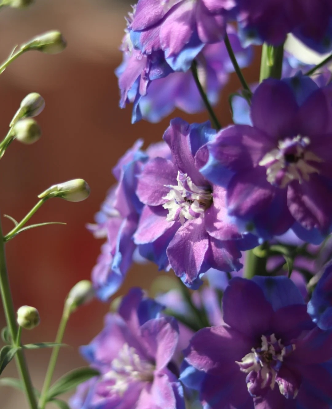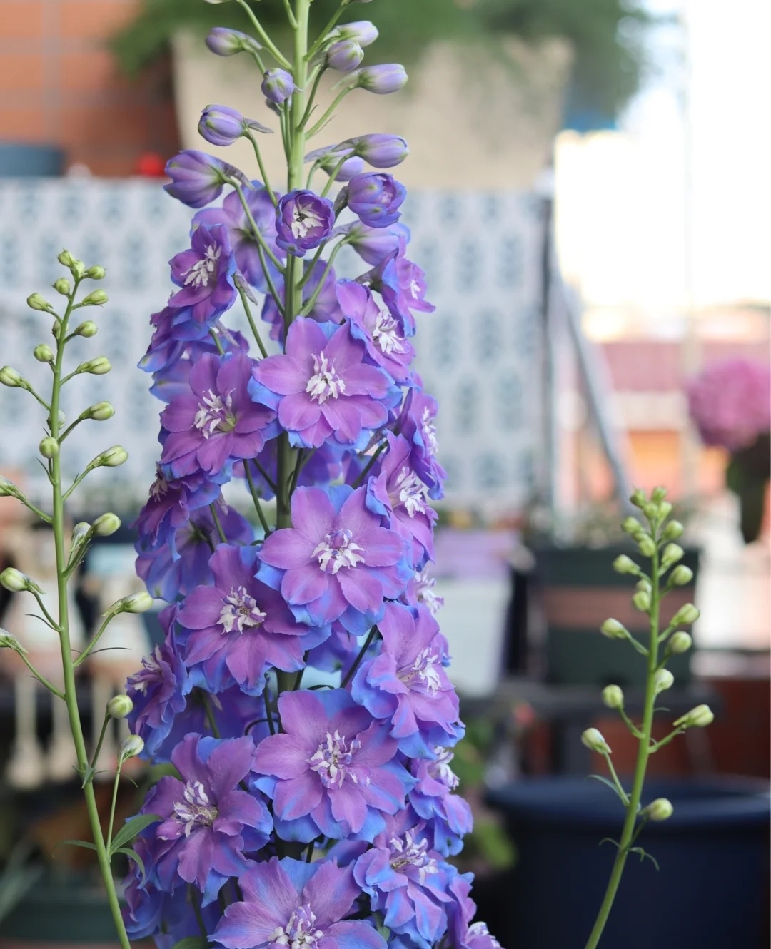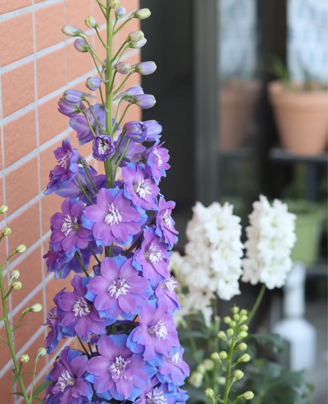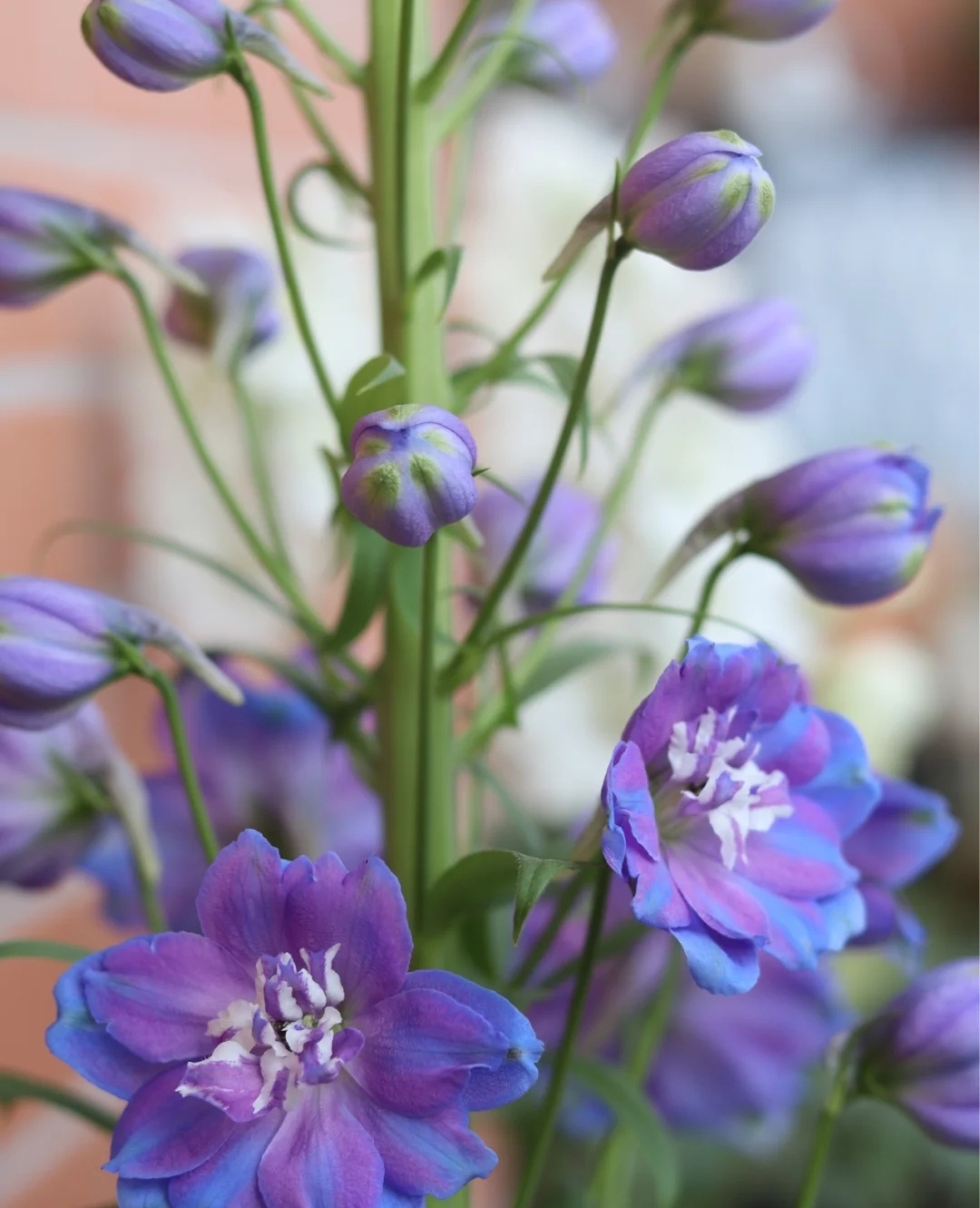 大花飞燕草Delphinium elatum,也叫高翠雀花,是花艺作品、园艺造景中常用的线性花材。花期是每年6月-9月,常见颜色有蓝、紫、粉、白。今天分享的这个蓝紫色的品种叫晨光·Morning lights