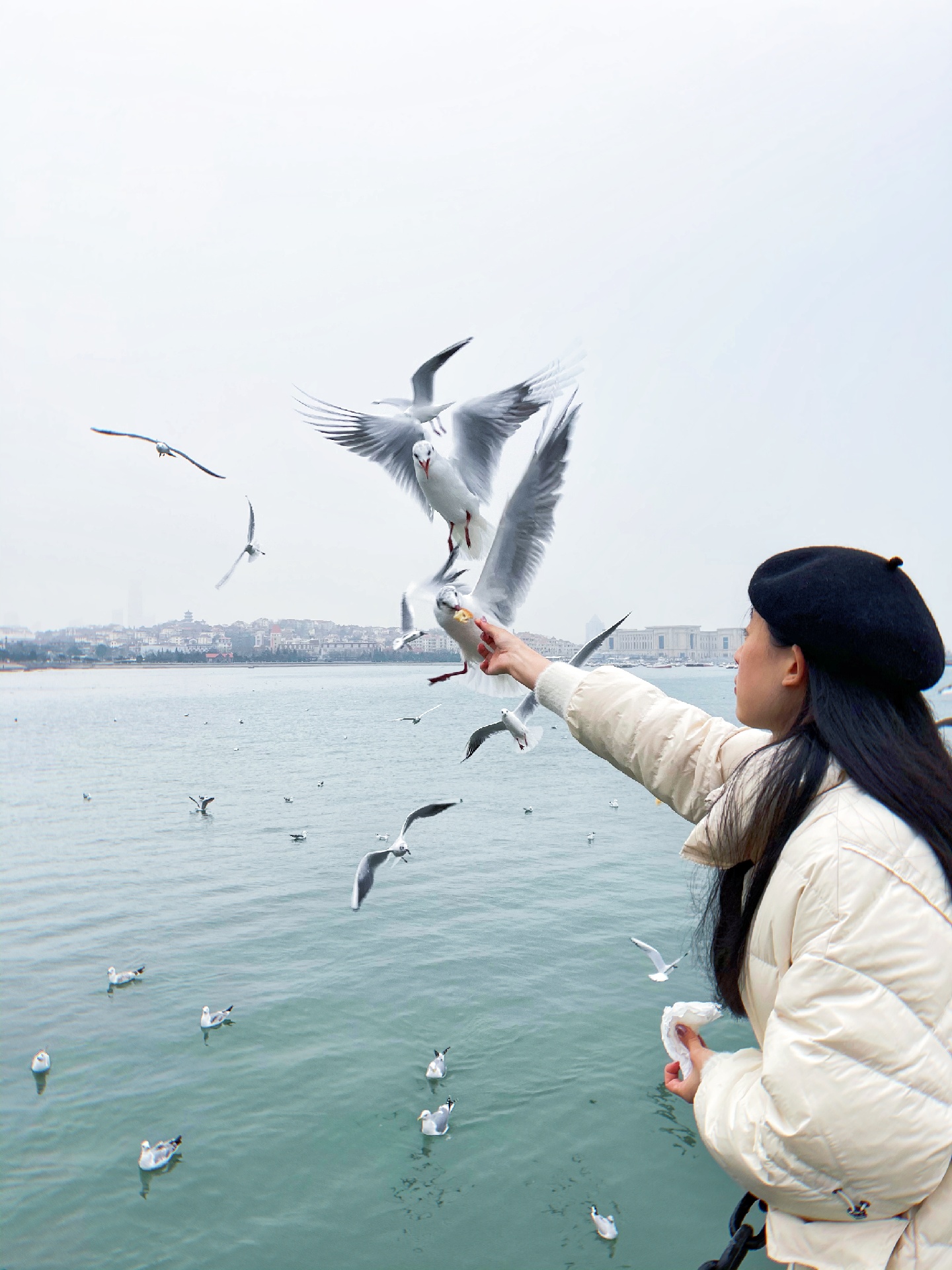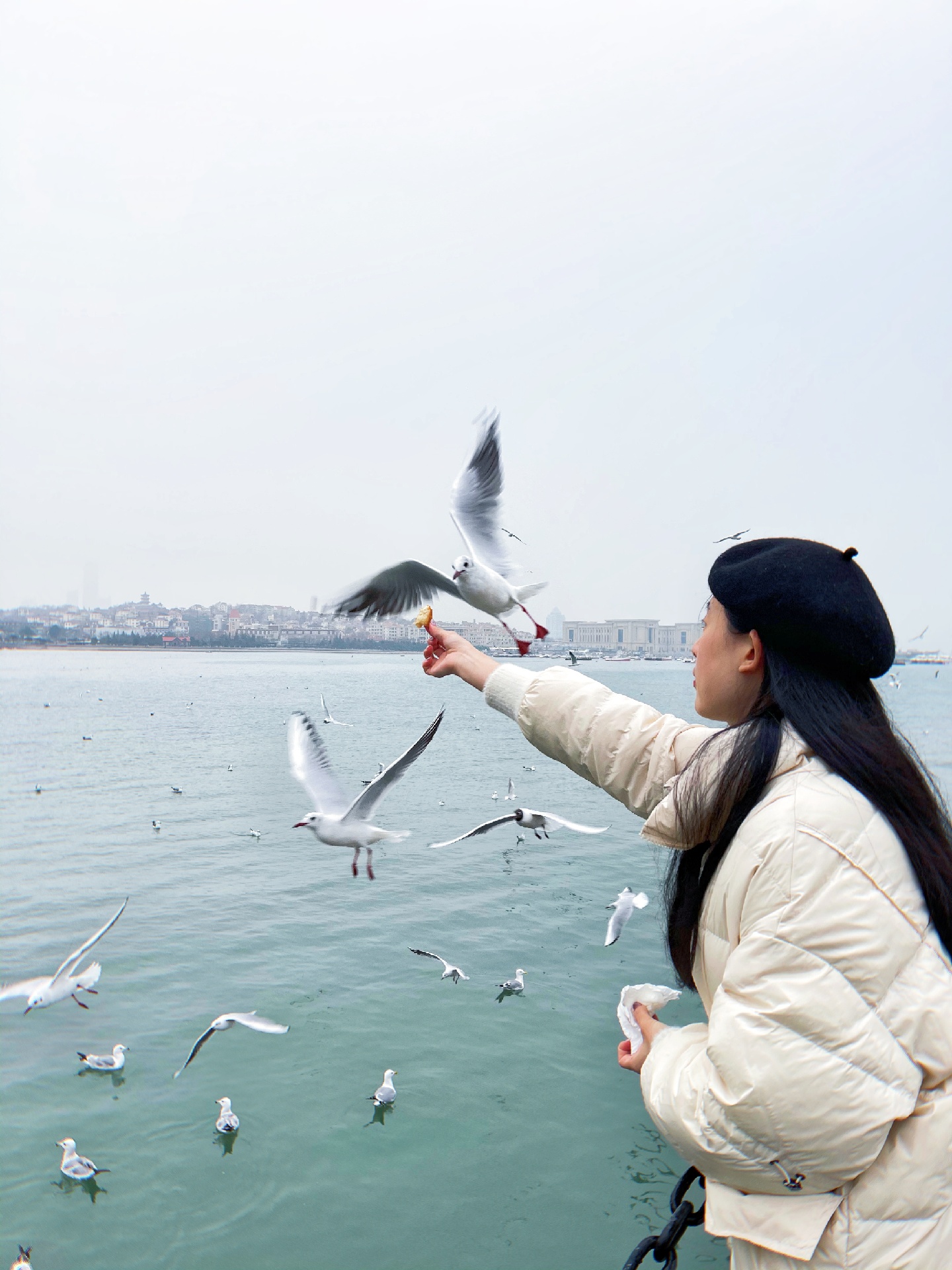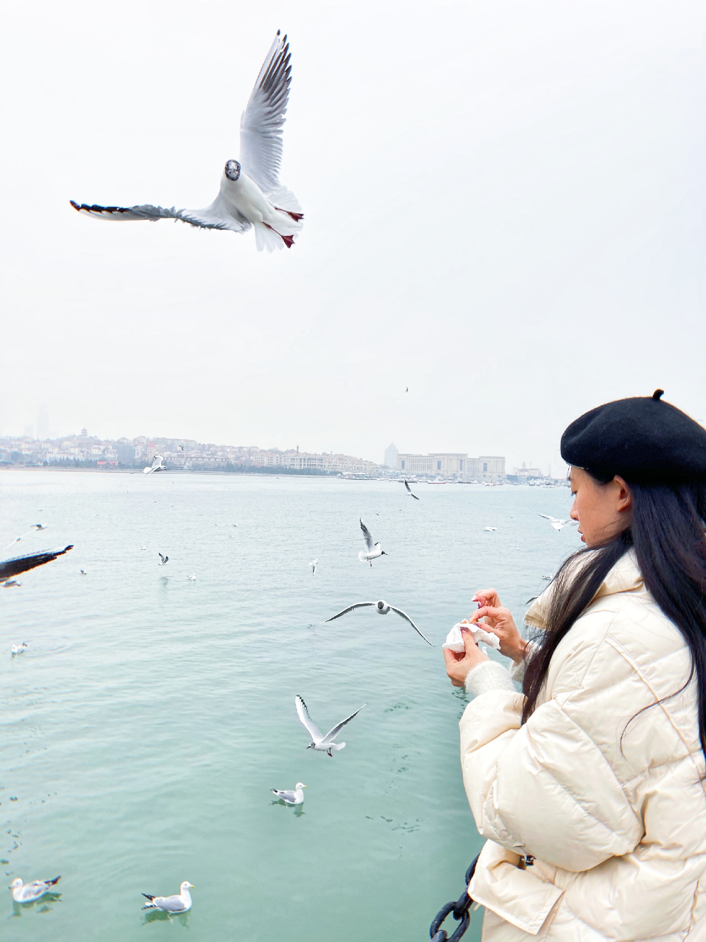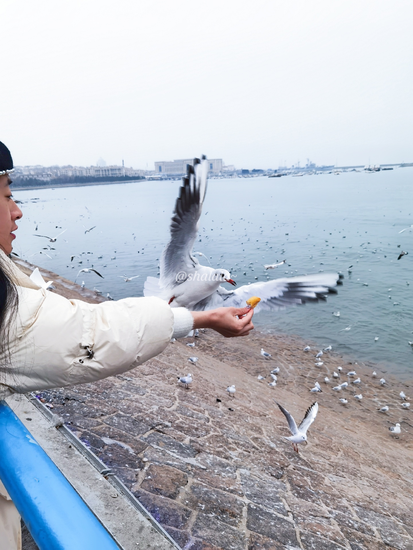 青岛栈桥海鸥,去的时候人超级多,一点要记得提前买油条哦,因为现场买的话很贵,3块钱一点点一小袋。