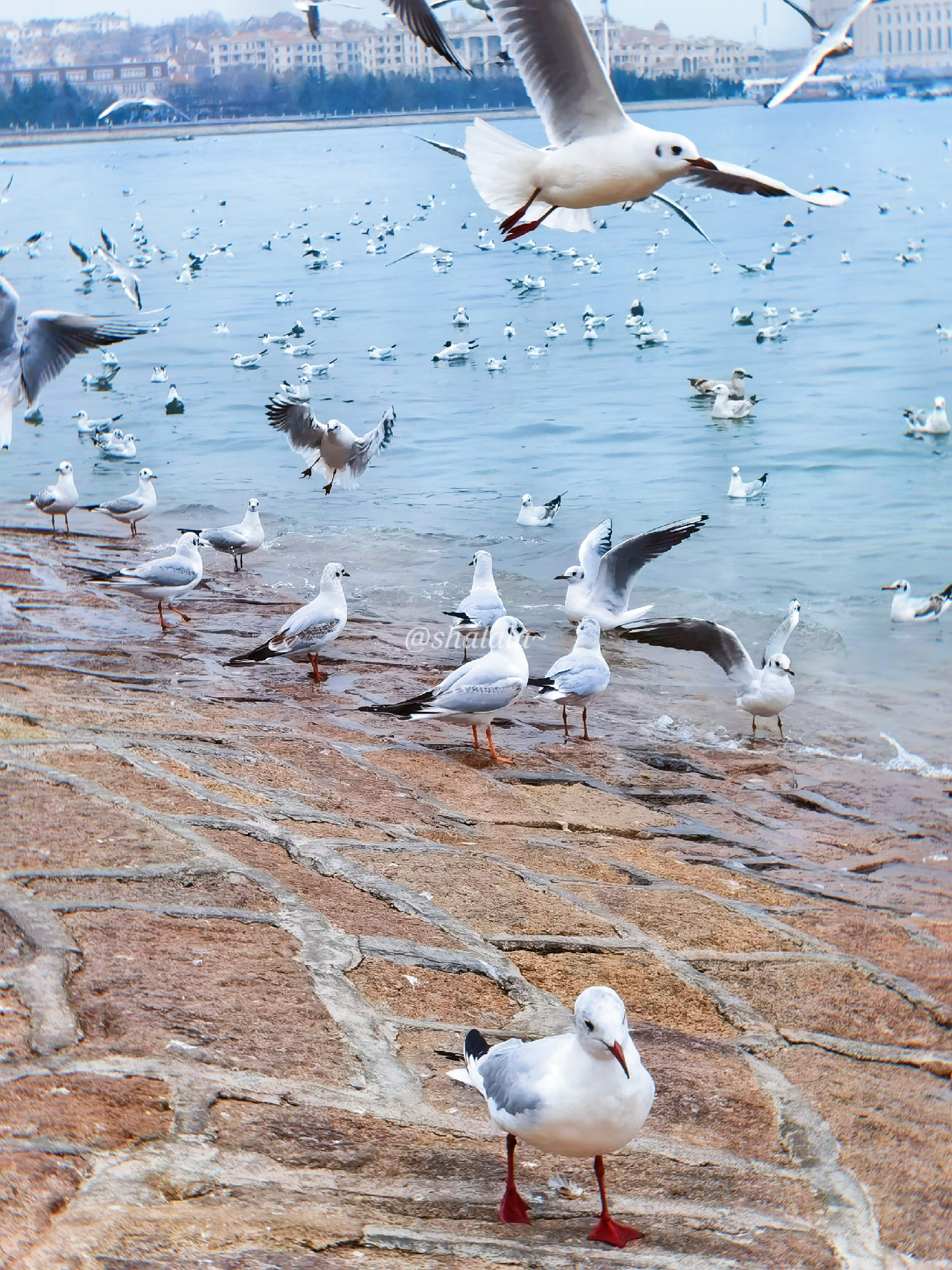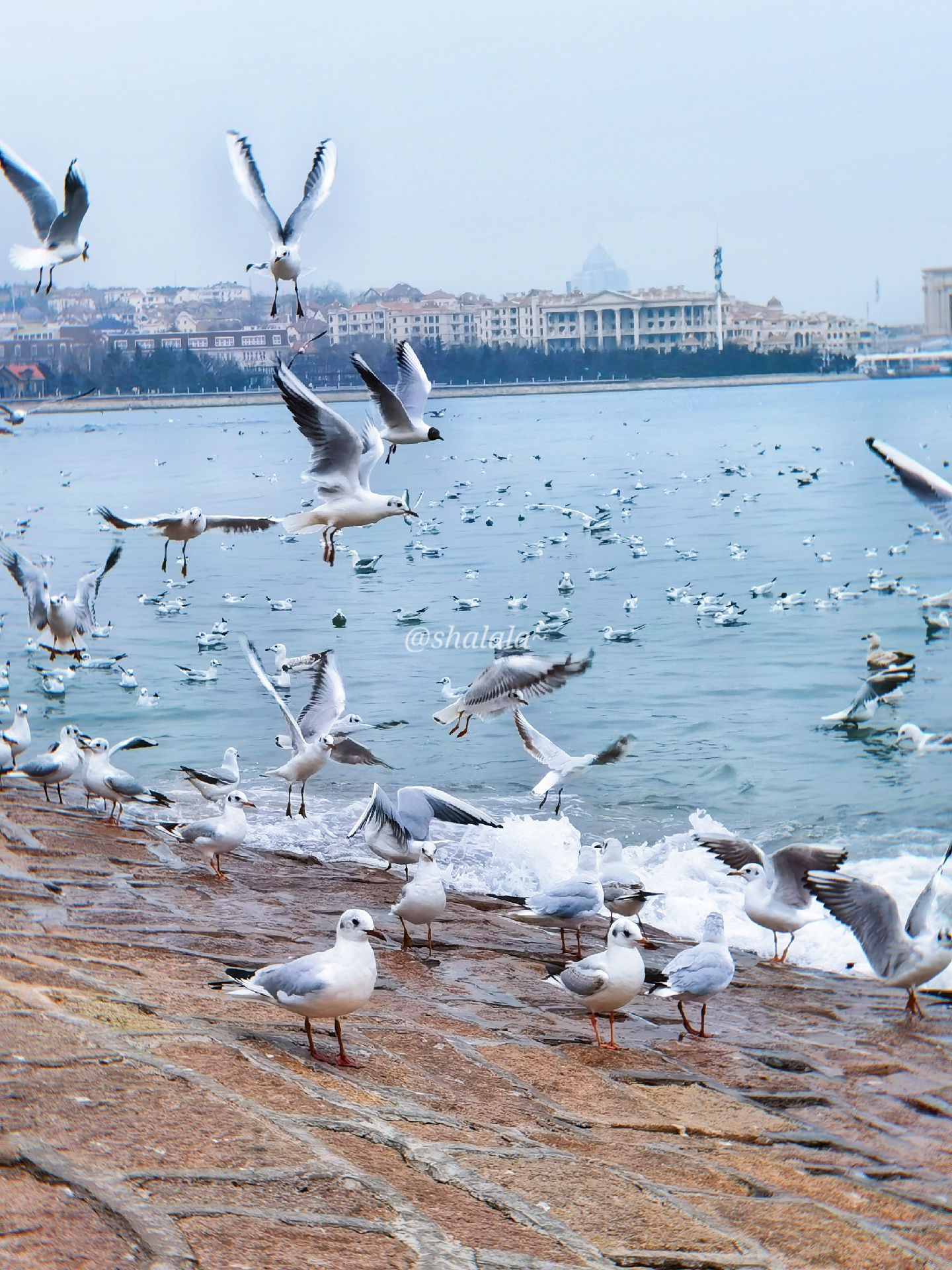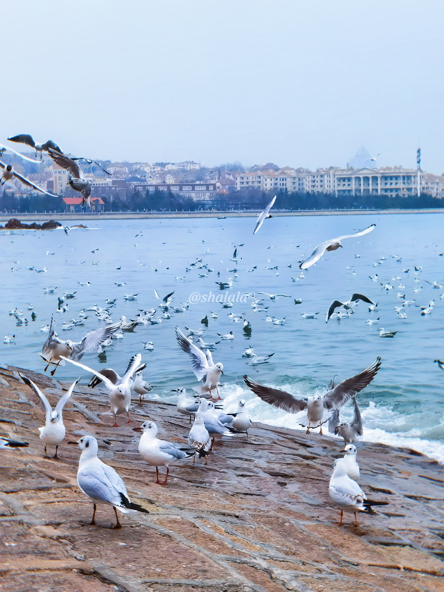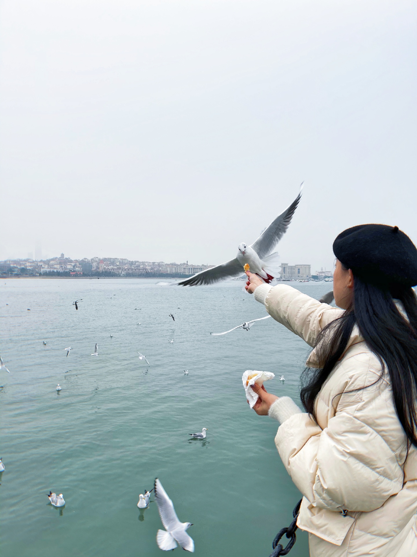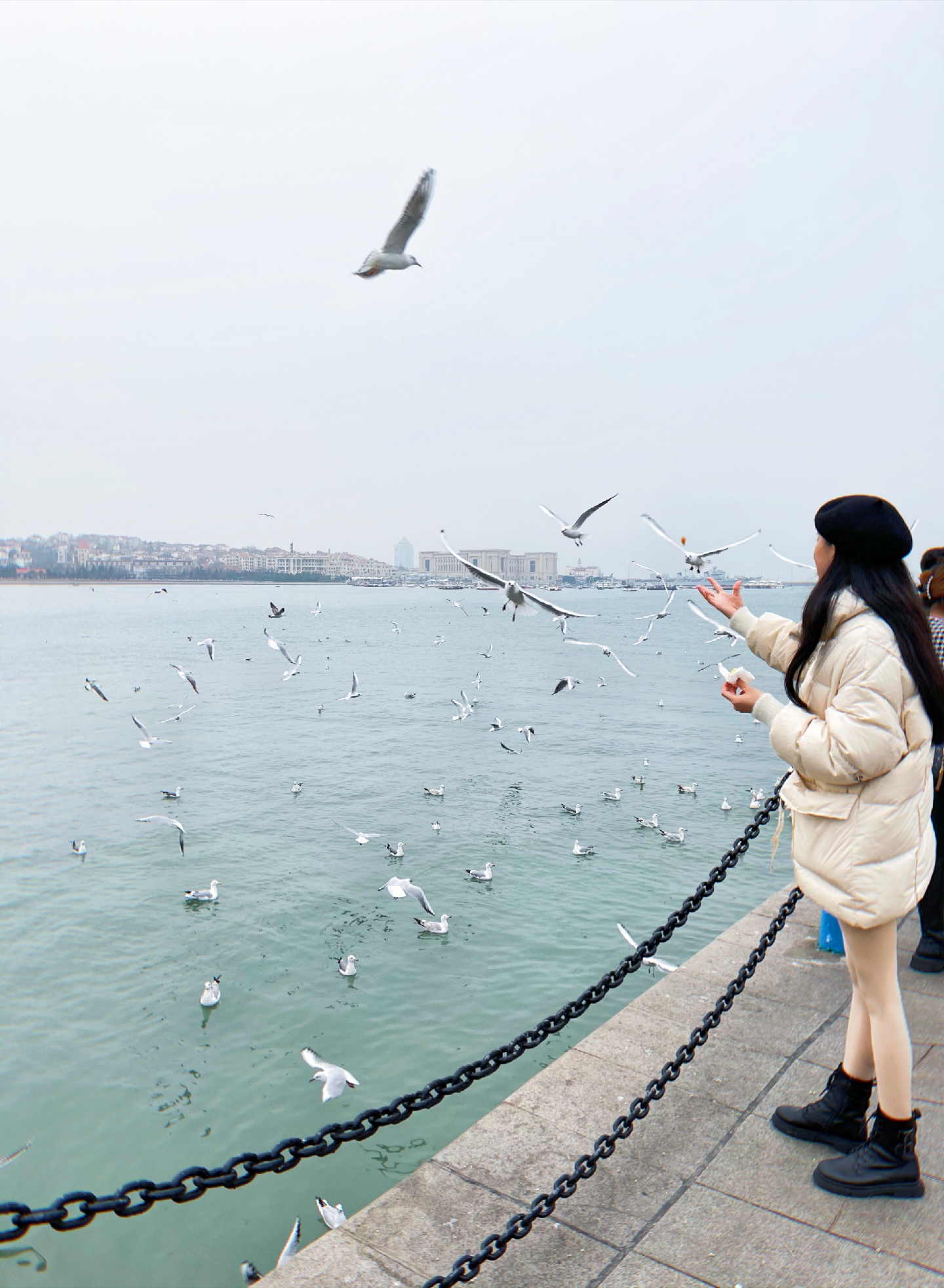 青岛栈桥海鸥,去的时候人超级多,一点要记得提前买油条哦,因为现场买的话很贵,3块钱一点点一小袋。