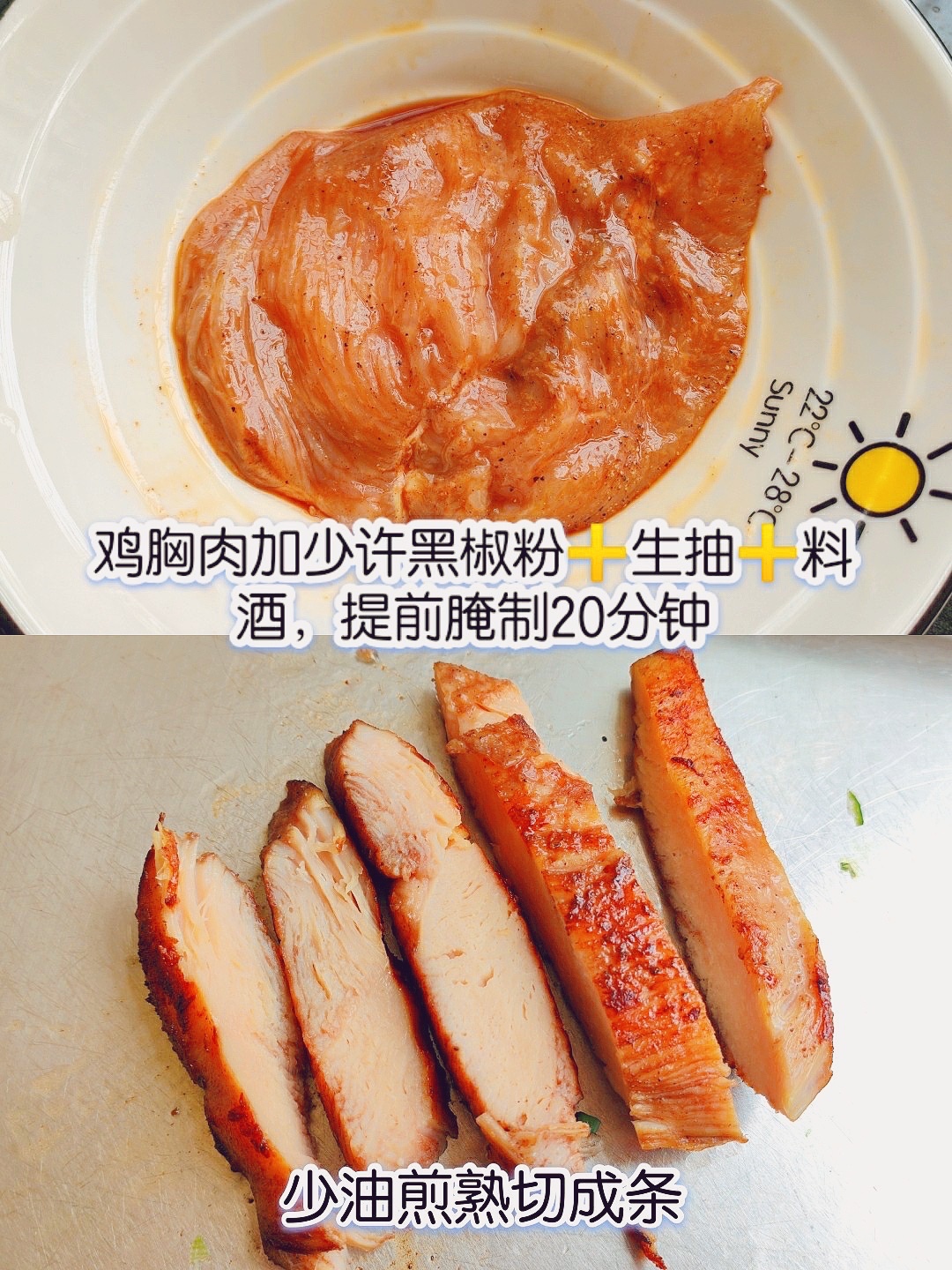 鸡胸肉少许黑椒粉十生抽十料酒,提前腌制20分钟。