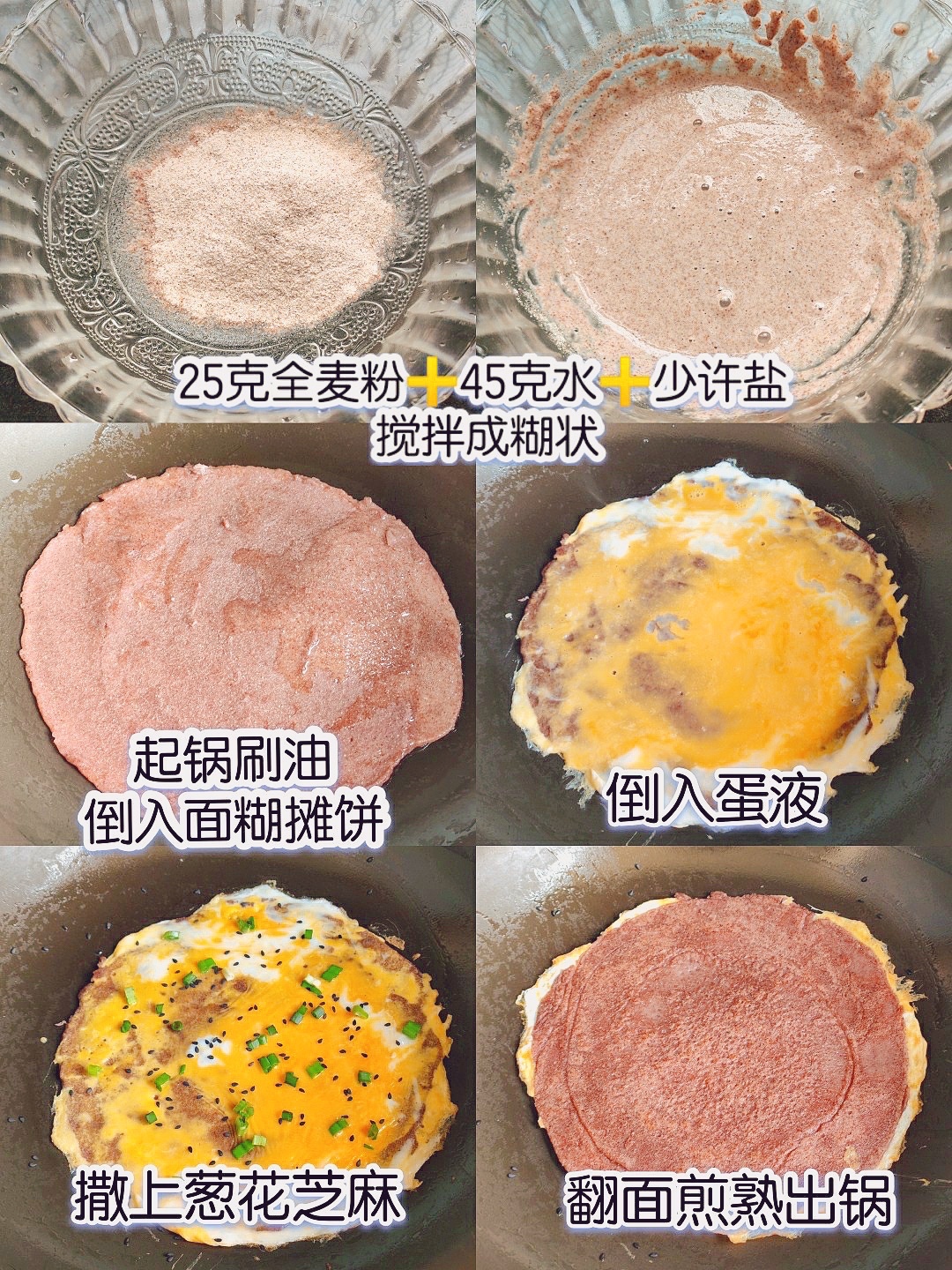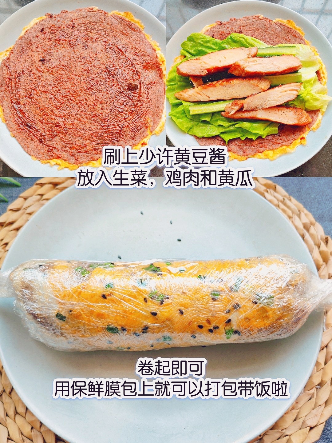 用料:全麦粉25克,凉水45克,鸡蛋1个,鸡胸肉,黄瓜,生菜,黄豆酱