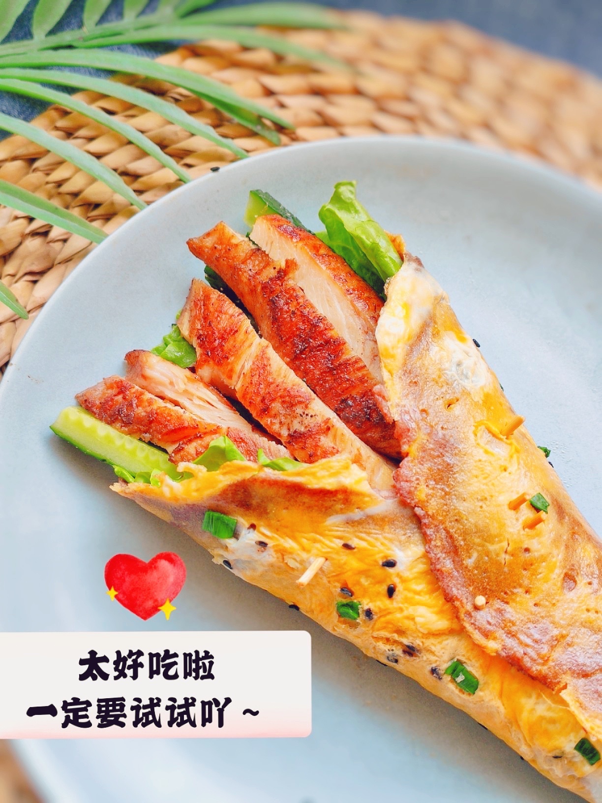 3锅里刷一点油,倒入面糊,摊成圆饼,待煎饼凝固后打上ー个鸡蛋平,撒上葱花芝麻,翻面煎熟盛出。4煎饼刷上黄豆酱,铺上生菜煎鸡肉黄瓜,卷起来即