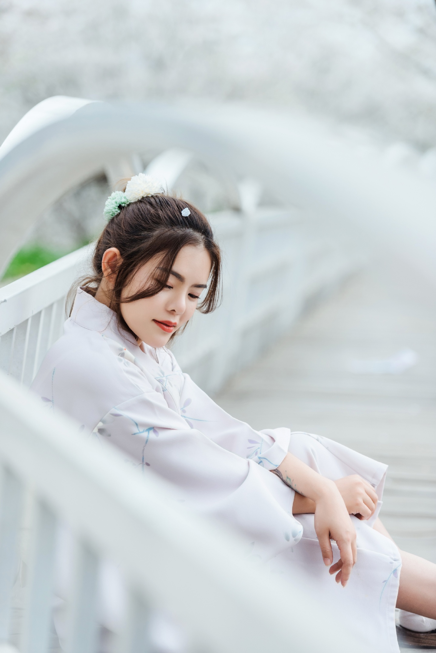 4.👉 妆容:淡雅,搭配一个丸子头,两侧的头发弄凌乱蓬松一点,丸子的位置,带一朵花花,就搞定啦