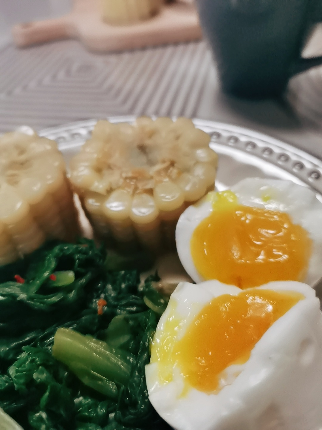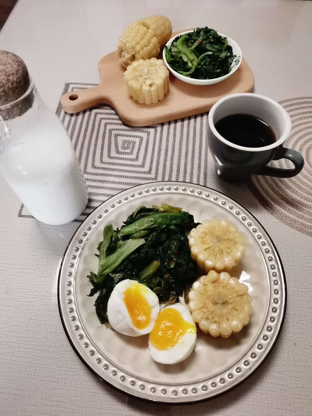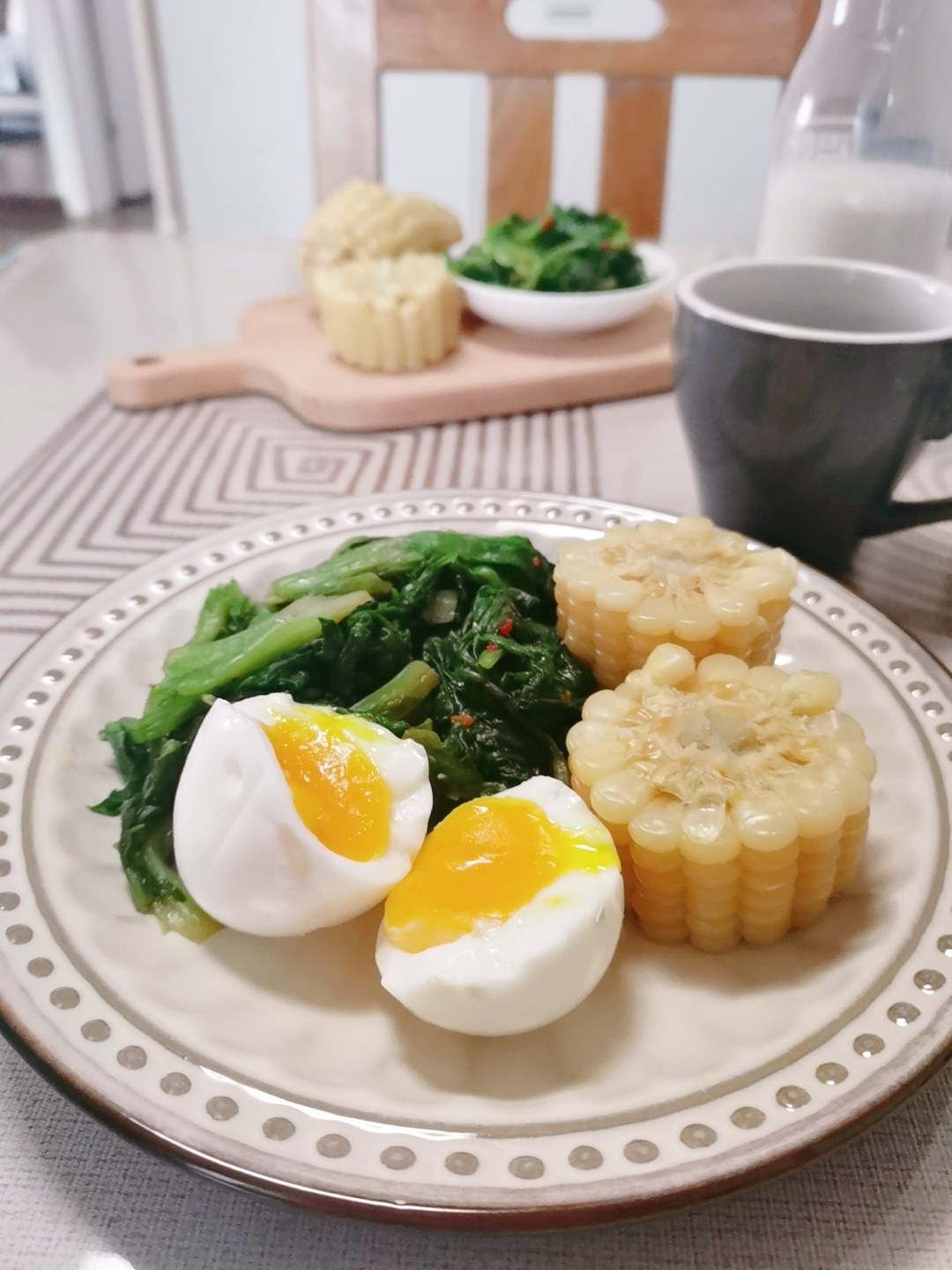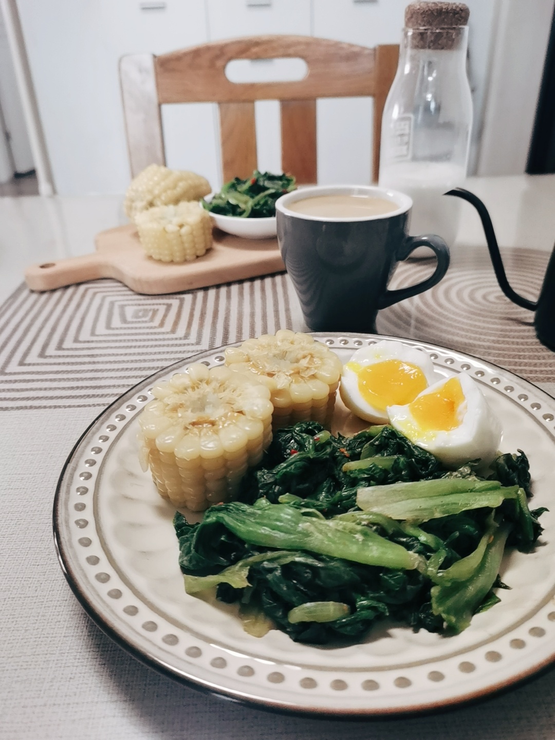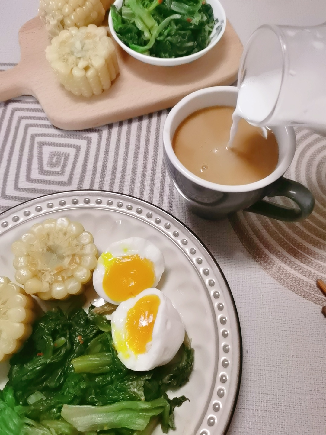 早餐:煮玉米,水煮蛋,拌生菜,拿铁