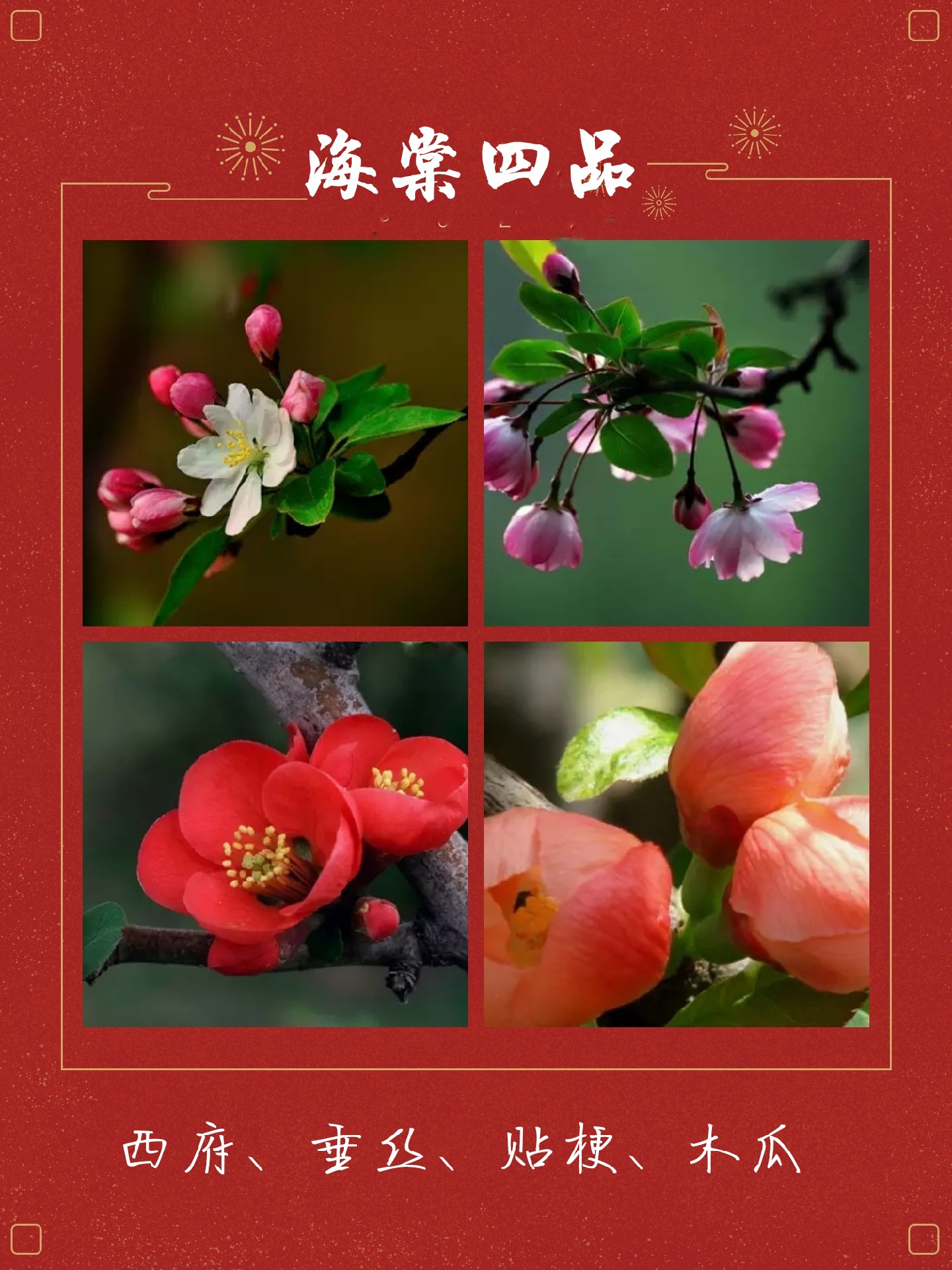 海棠自古为雅俗共赏名花,素有花中仙子、花贵妃之誉。海棠有四品::西府海棠,花开娇艳!垂丝海棠,柔蔓迎风!贴梗海棠,三五成簇!木瓜海棠,花色烂漫!