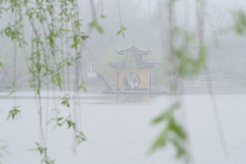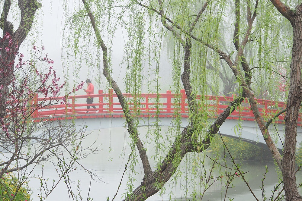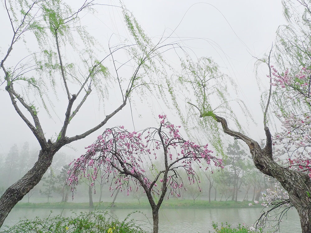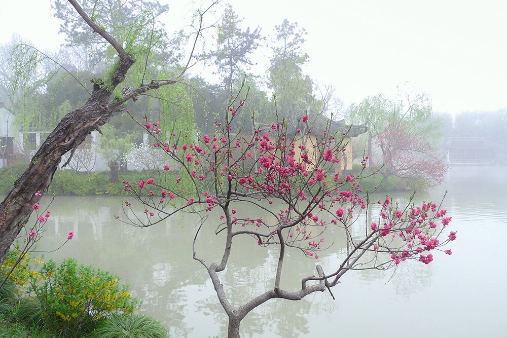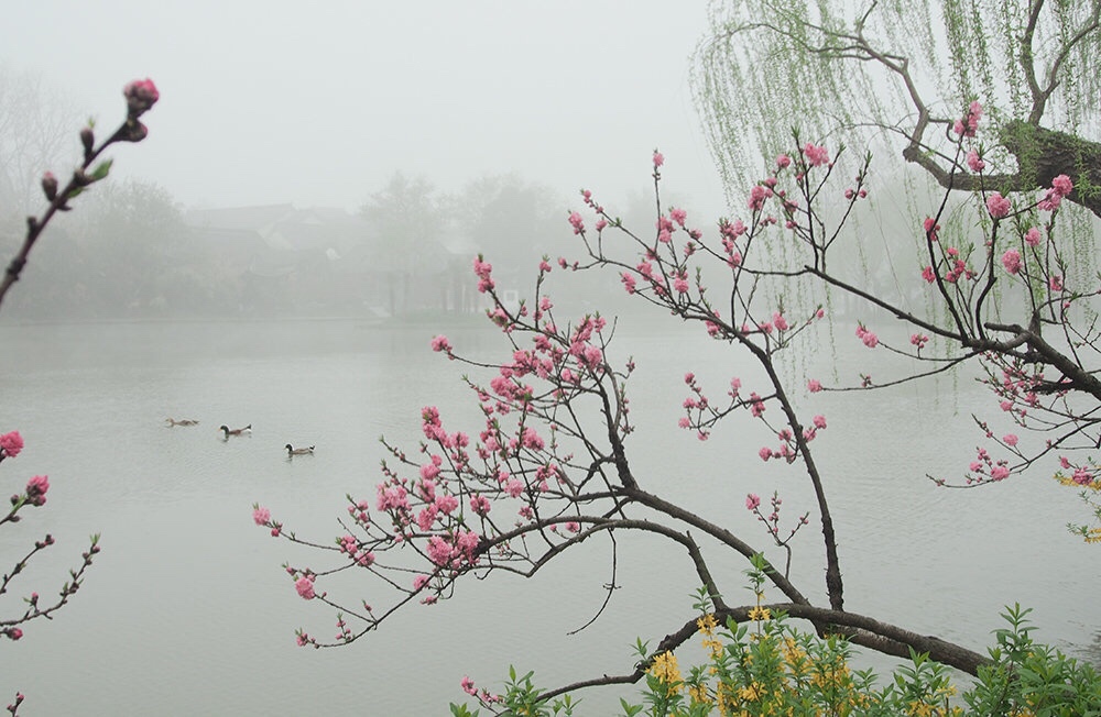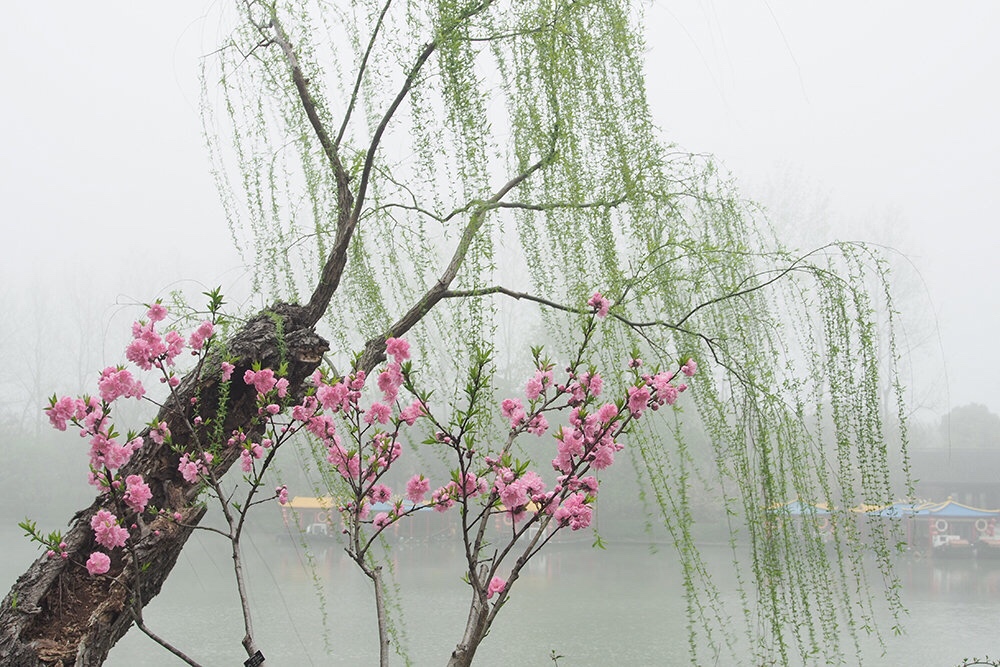 一半楼台杨柳烟,一半枝头桃花彤。