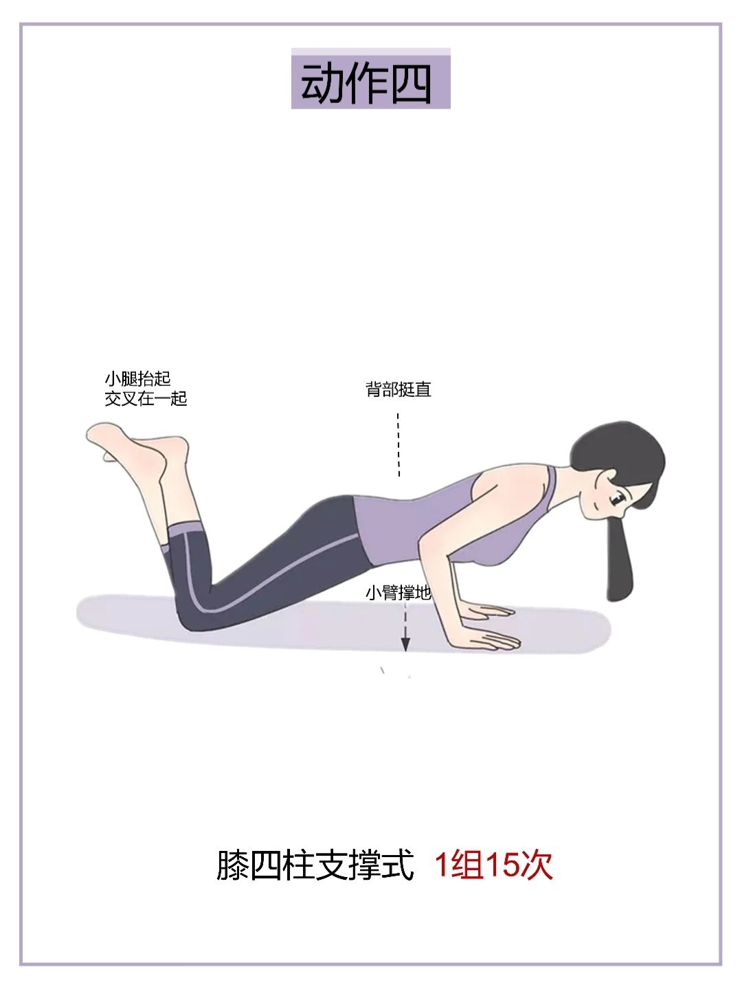 小臂撑地,小腿抬起交叉在一起跪姿,背部挺直,不要弓腰,保持腹部核心收紧1组15次