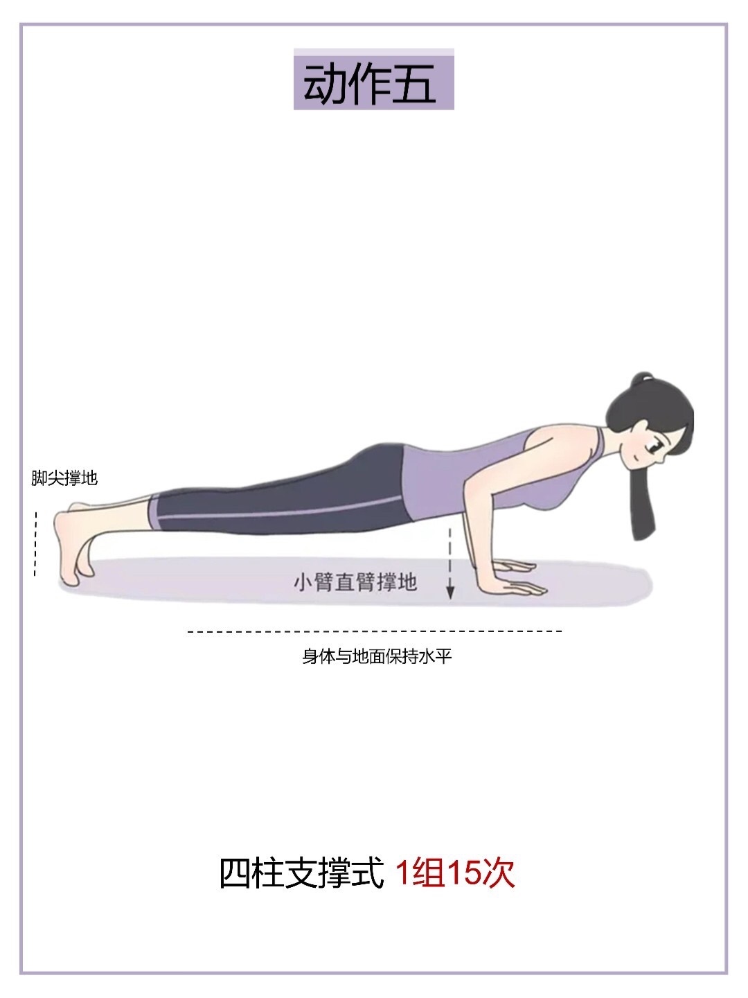 身体与地面保持水平,小臂直臂撑地,脚尖撑地,臀部收紧,腹部核心收紧1组15次